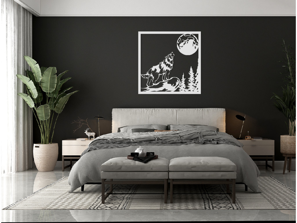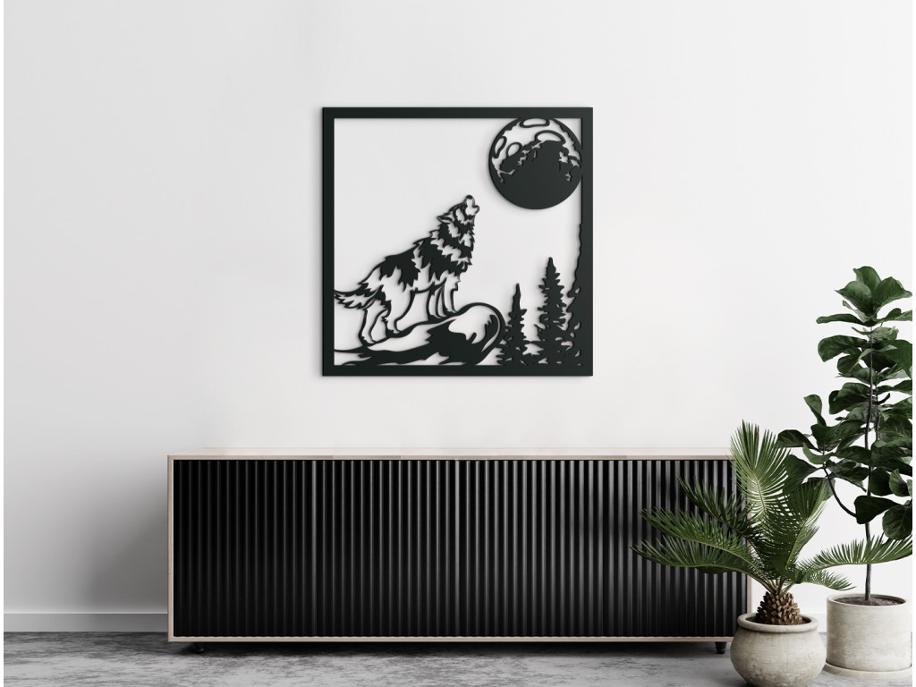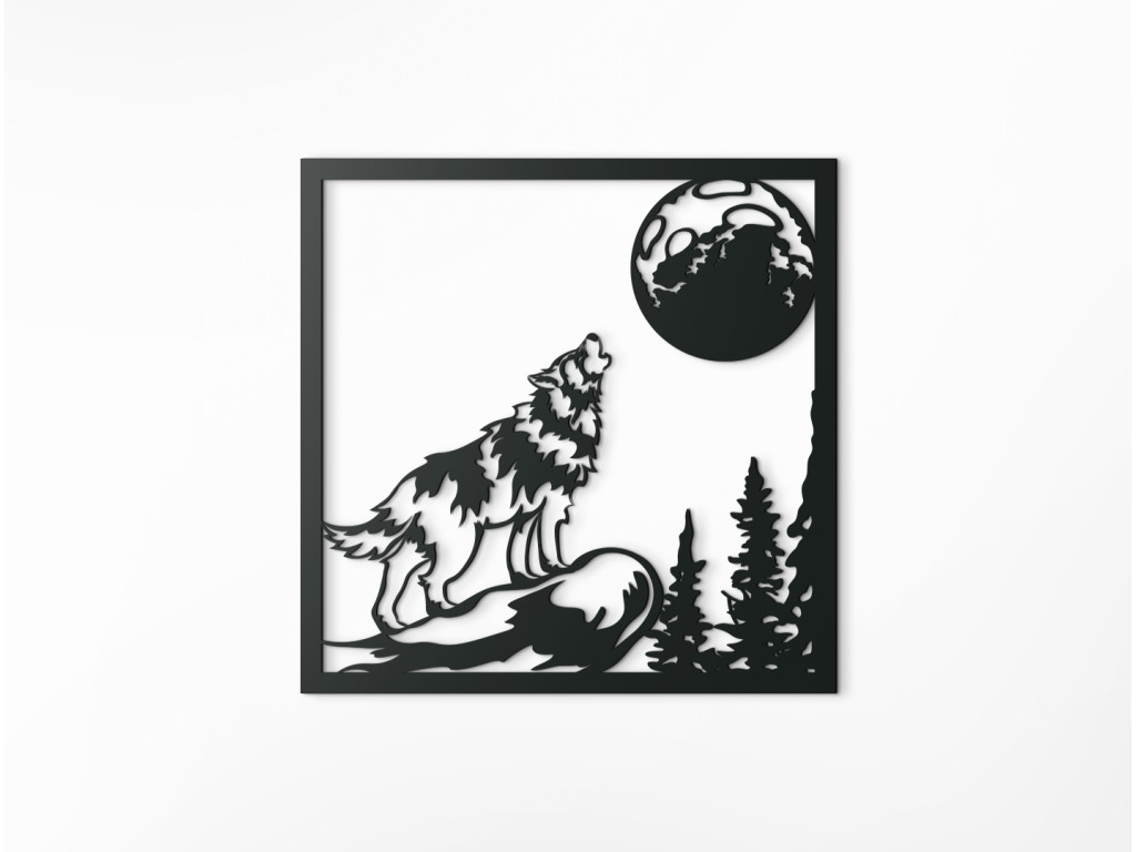 Drevený obraz znázorňujúci vlka, ktorý stojí na skale nad lesmi a vyje na mesiac, svojím námetom vyvoláva príjemné zimomriavky. Pôsobivá dekorácia vynikne na farebných i bielych stenách. Zavesiť ho môžete do obývačky, pracovne, predsiene i spálne. Obraz je vhodný pre všetkých, ktorí majú radi nevšedné a tajuplné motívy..