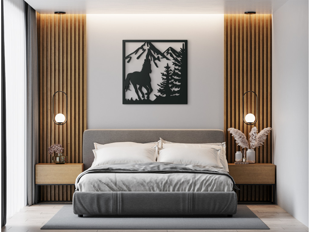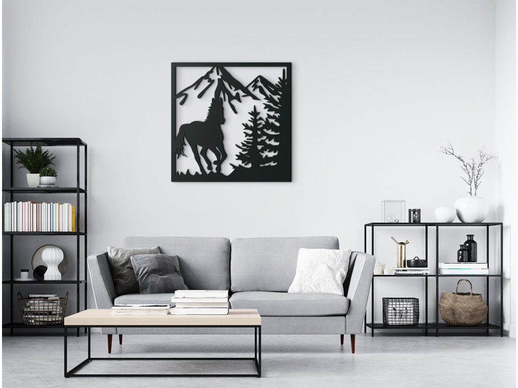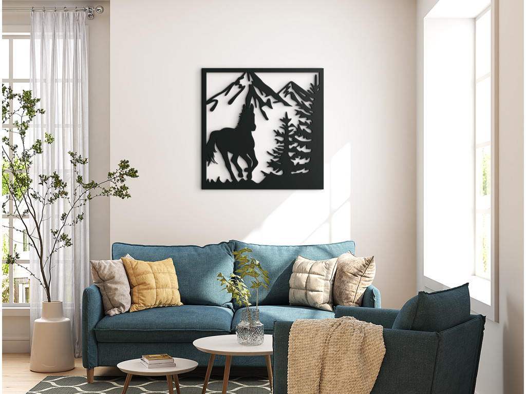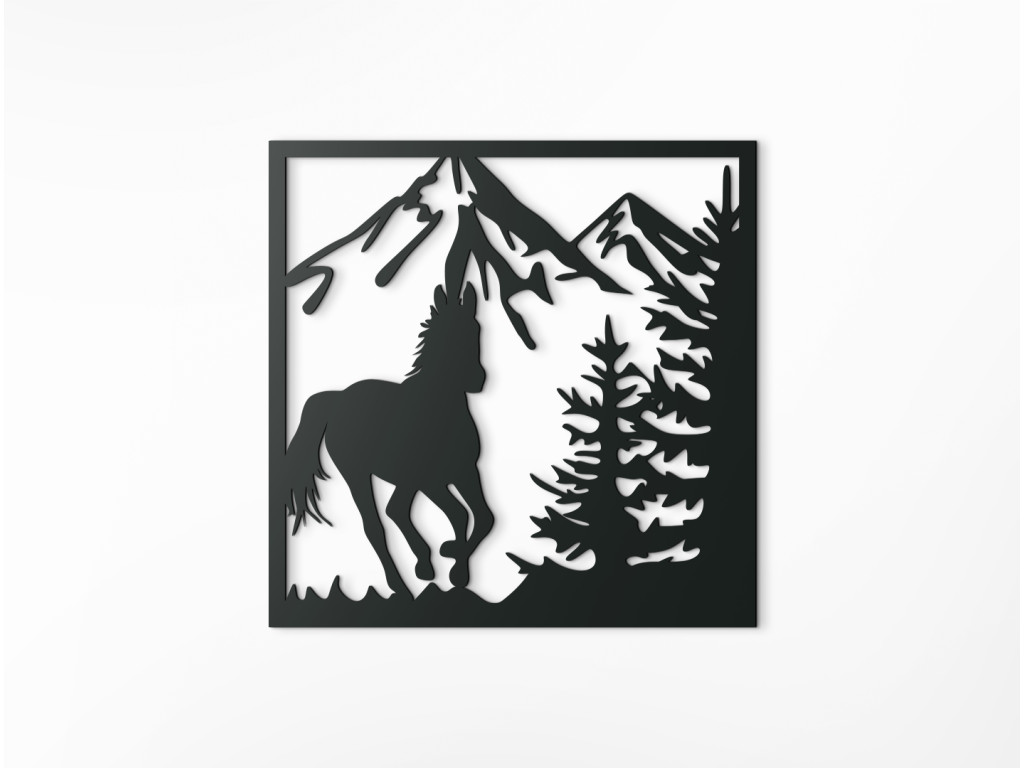 Drevená dekorácia na stenu Cválajúci kôň bude výrazným doplnkom, ktorý si určite všimne každá návšteva. Obraz ponúka pohľad na koňa v plnom cvale s vejúcim chvostom, ktorý sa slobodne preháňa v hornatej krajine. Za ním sa do výšky týčia majestátne končiare a scenériu dotvárajú ihličnaté stromy nachádzajúce sa na boku v popredí.
