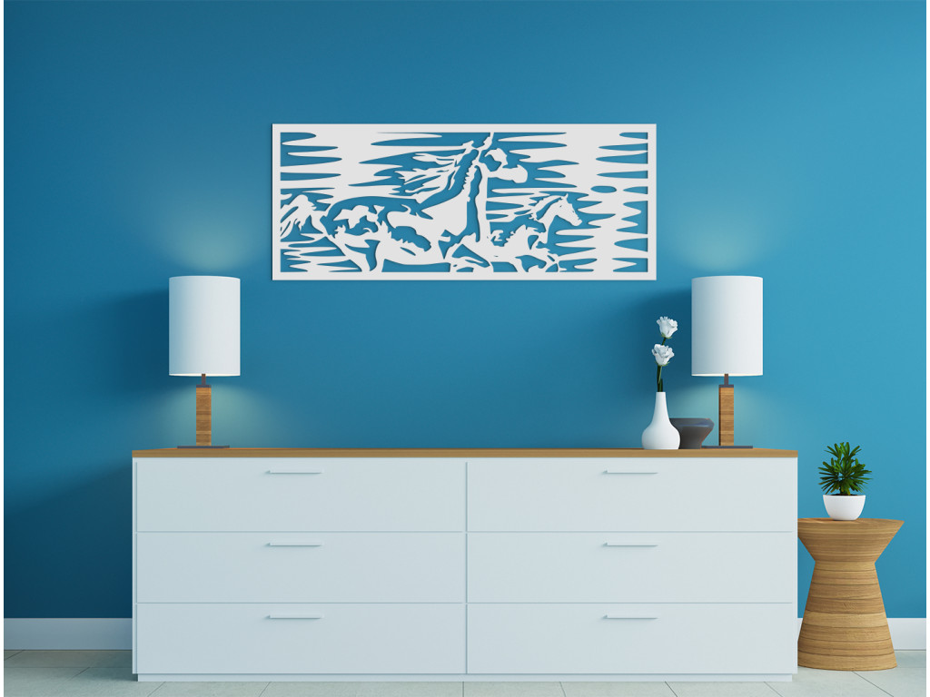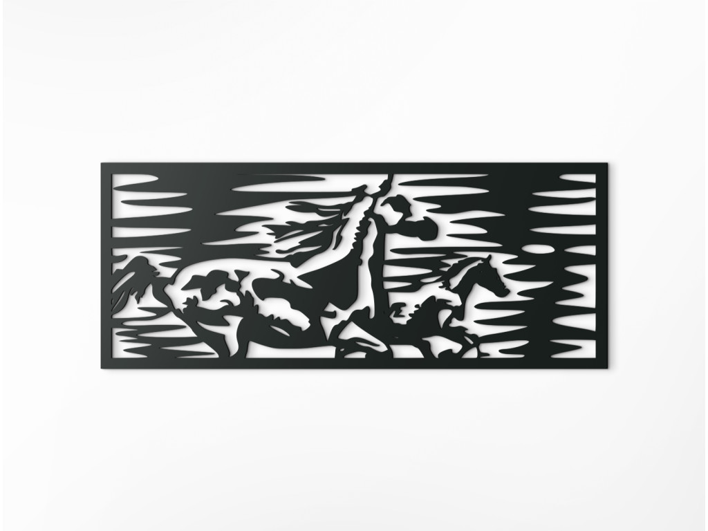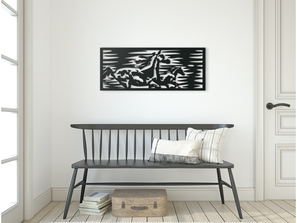 Moderný drevený obraz s pútavým námetom cválajúcich koní chytí za srdce nejedného koničkára. Ušľachtilé zvieratá znázornené v plnom cvale pôsobia energickým a nespútaným dojmom a vnesú do miestnosti závan slobody a radosti z pohybu.