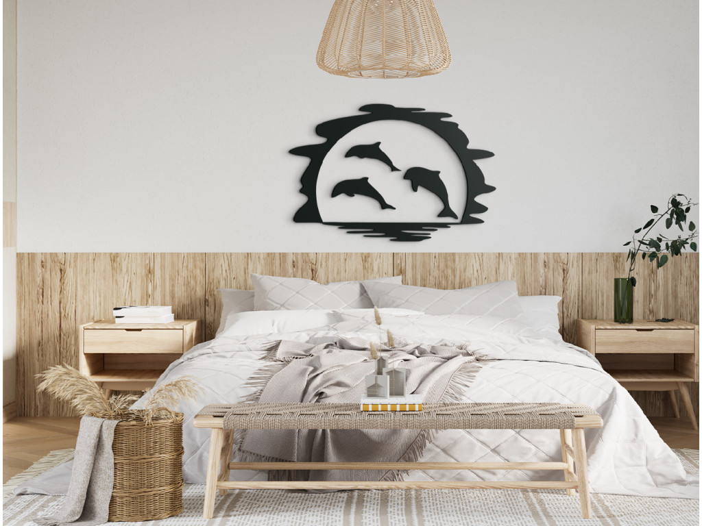 Nechajte vplávať kúsok exotiky do vášho domova. Drevená nálepka Delfíny vytvorí vo vašom domove originálny dizajn s puncom pokoja. Romantický nádych obrazu dodávajú tri skákajúce delfíny pri západe slnka. Jednoduchú a zároveň originálnu dekoráciu môžete zavesiť do obývačky, spálne, chodby aj kancelárie.