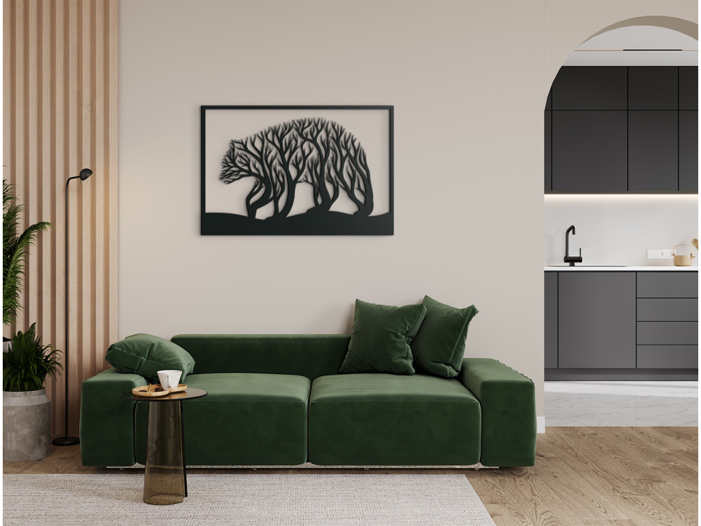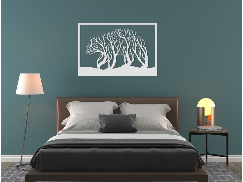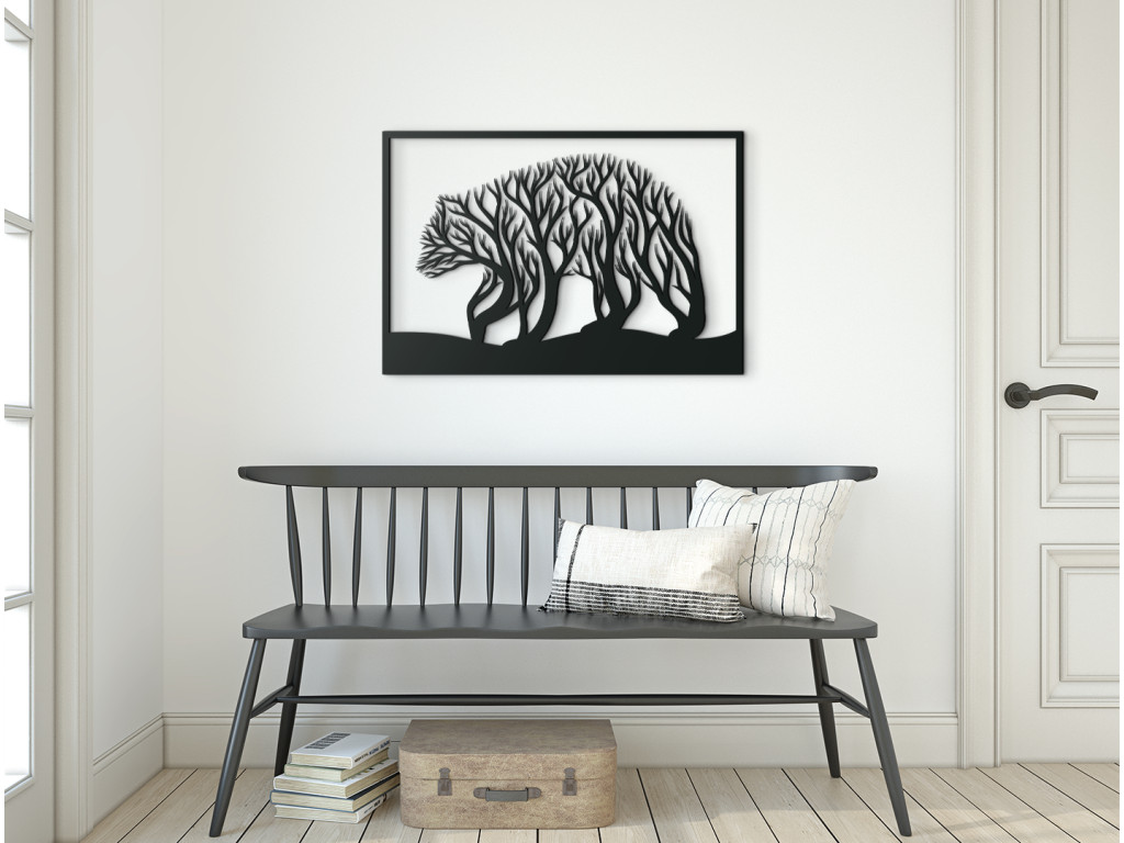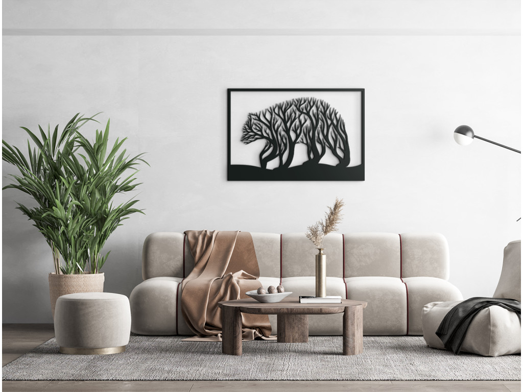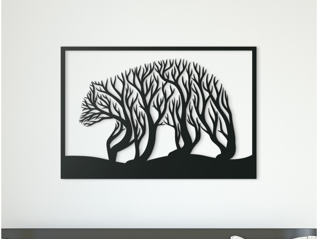 Dizajnovo zaujímavý kúsok Medveď a stromy je štýlovým doplnkom, ktorý oceníte v modernom aj klasickom interiéri. Drevená nálepka zobrazuje medveďa, ako kráča po zvlnenom teréne, avšak bližší pohľad zachytí aj stromy, ktoré vlastne tvoria medvedie telo. Obrazom tiež potešíte milovníkov hôr, poľovníkov či turistov.