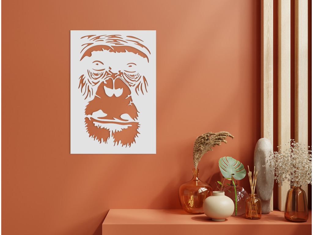 Recréez l'atmosphère de la forêt tropicale sous nos latitudes grâce à ce tableau mural en bois représentant une tête de chimpanzé dans un style moderne.