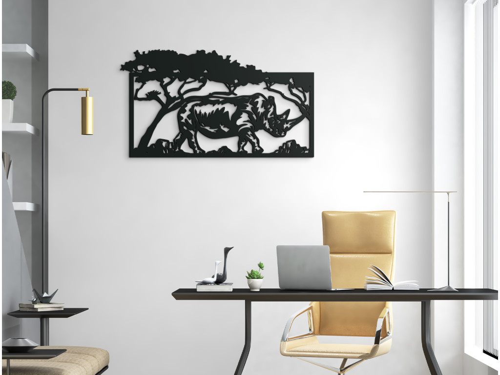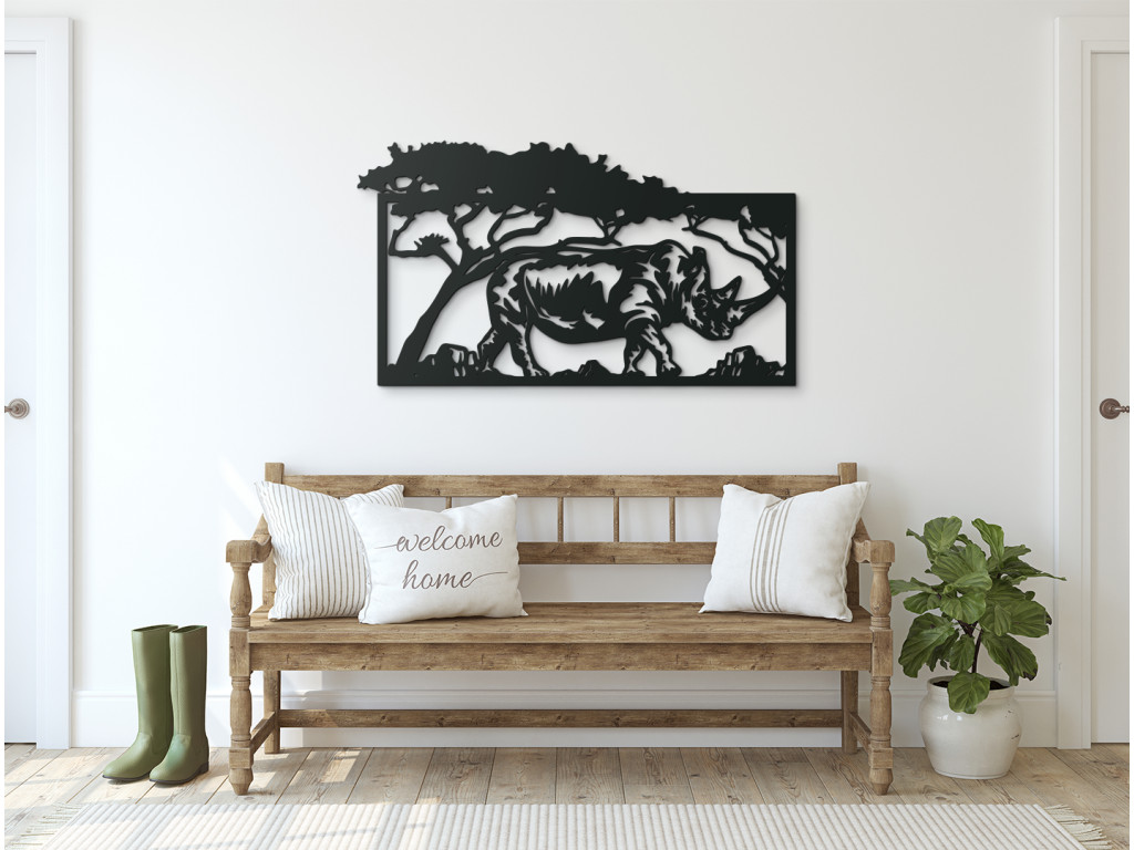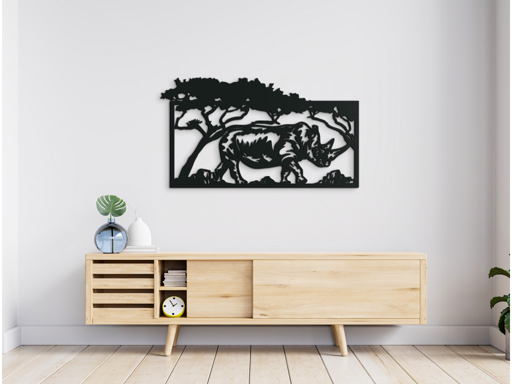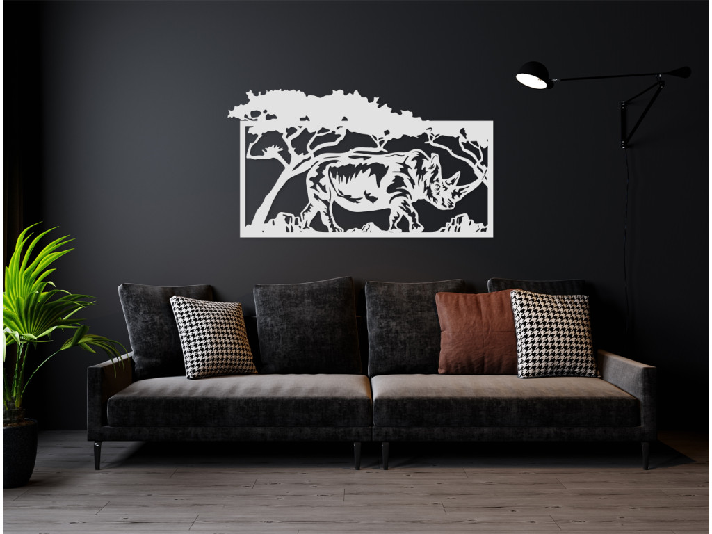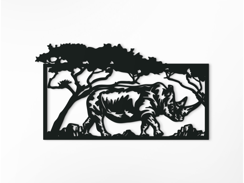 Exotický motív obrazu Nosorožec v savane prinesie do miestnosti závan horúcej Afriky aj počas najtuhšej zimy. Drevená dekorácia vykresľuje obraz nosorožca pokojne sa prechádzajúceho savanou. Hrubokožec kráča v tieni stromov, pričom ich koruny na jednej strane presahujú rám obrazu. Hrubokožec má zreteľne definované rohy a vytieňované telo.