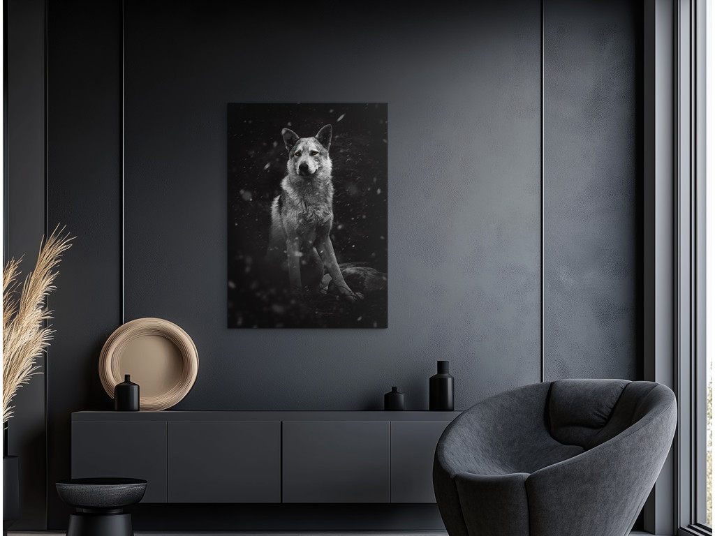 Le gardien de l'hiver est un portrait en noir et blanc d'un chien-loup tchécoslovaque assis immobile devant un fond sombre, tandis que des flocons de neige tourbillonnent autour de lui. Son regard direct est calme, mais en même temps pénétrant, comme s'il observait le monde avec sagesse et respect. Les détails de son pelage et l'expression de son visage renforcent le réalisme, tandis que le contraste avec le fond sombre et la neige fine ajoute profondeur et force tranquille à l'image.