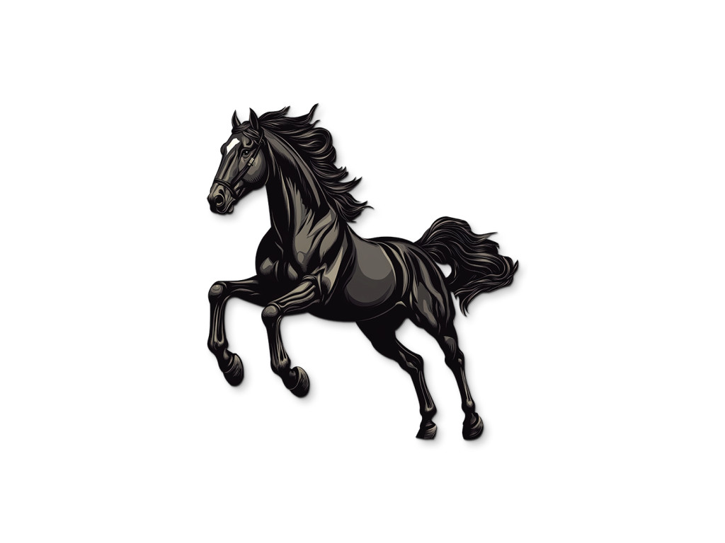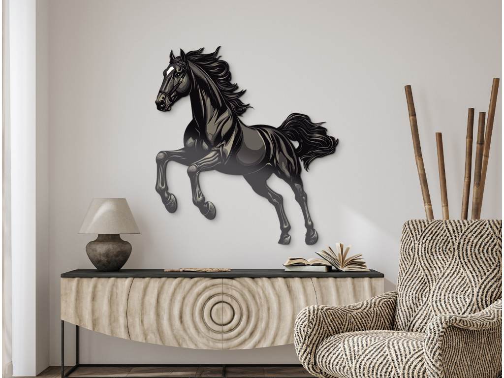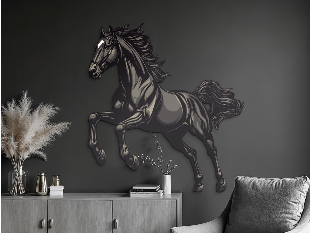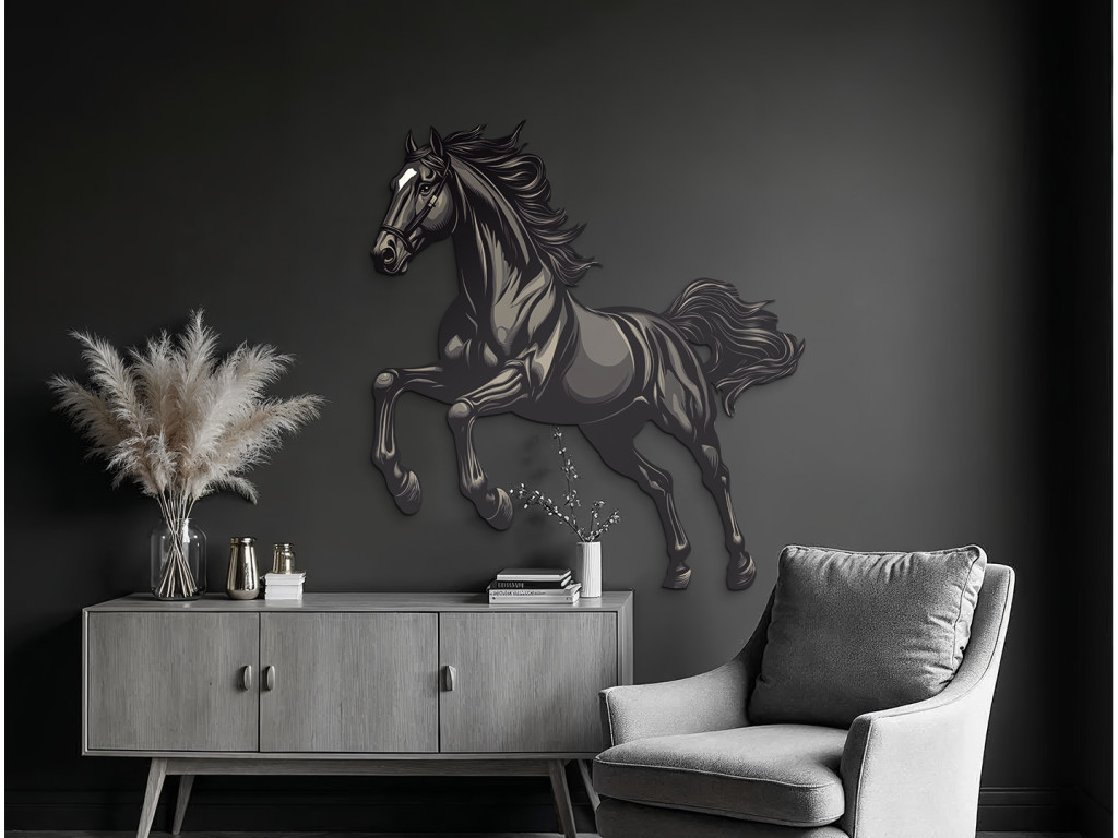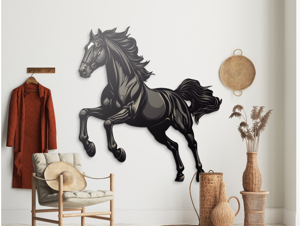 Cette décoration murale dynamique capture la silhouette d'un étalon noir au grand galop. Son corps puissant et sa crinière au vent incarnent la liberté, la force et l'énergie débridée – un symbole parfait d'élégance en mouvement.