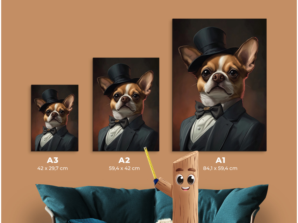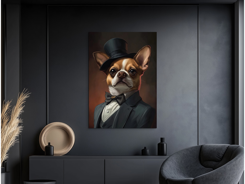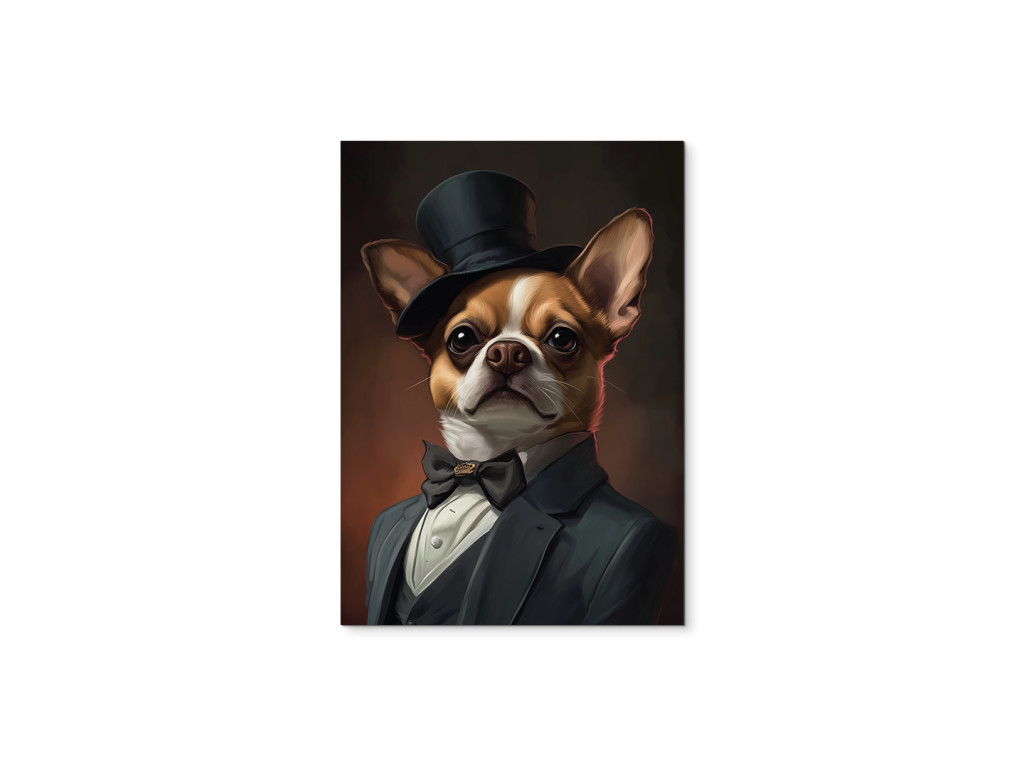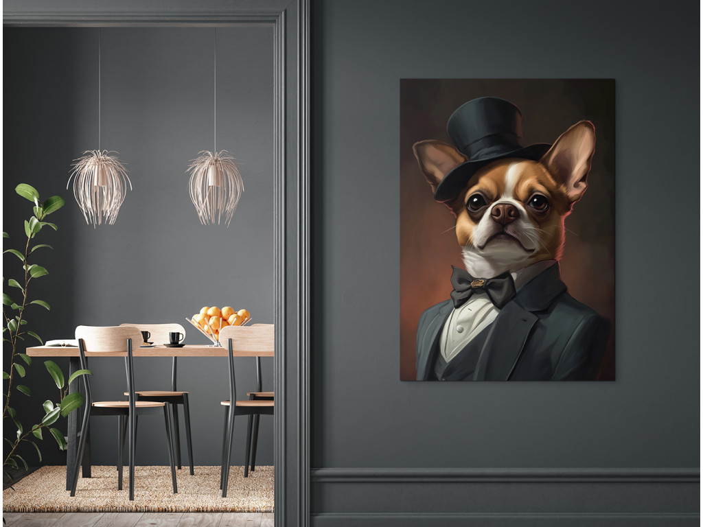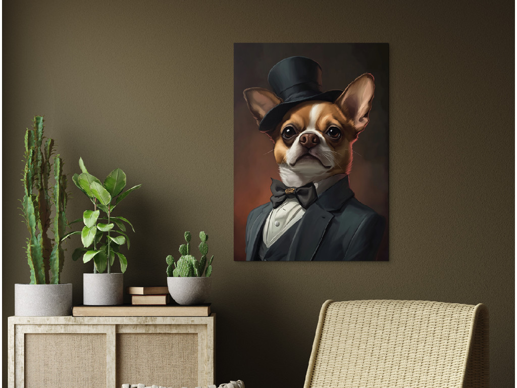 Gentleman de la race des chihuahuas est une œuvre à la fois drôle et élégante qui représente un chihuahua vêtu d'un costume raffiné et d'un haut-de-forme. Le traitement réaliste, combiné à l'humour, crée une pièce originale qui égayera n'importe quel intérieur et vous fera sourire. Ce tableau est idéal pour les amoureux des chiens, en particulier des chihuahuas, ou pour ceux qui souhaitent apporter une touche de personnalité, de recul et de charme artistique à leur intérieur.