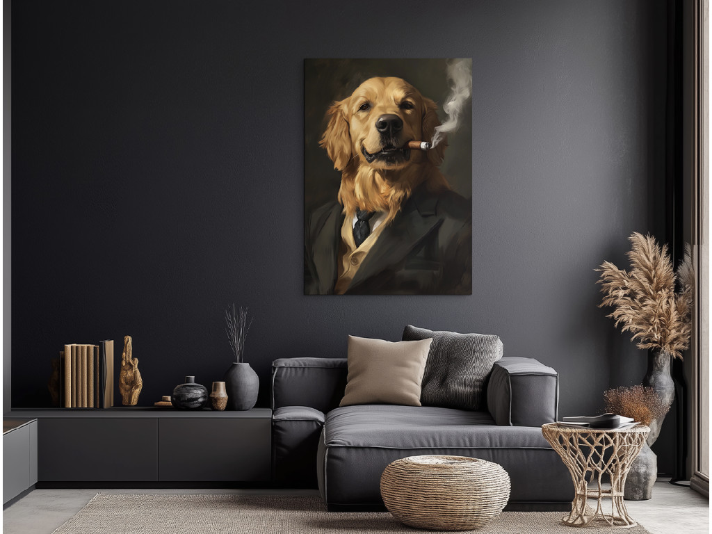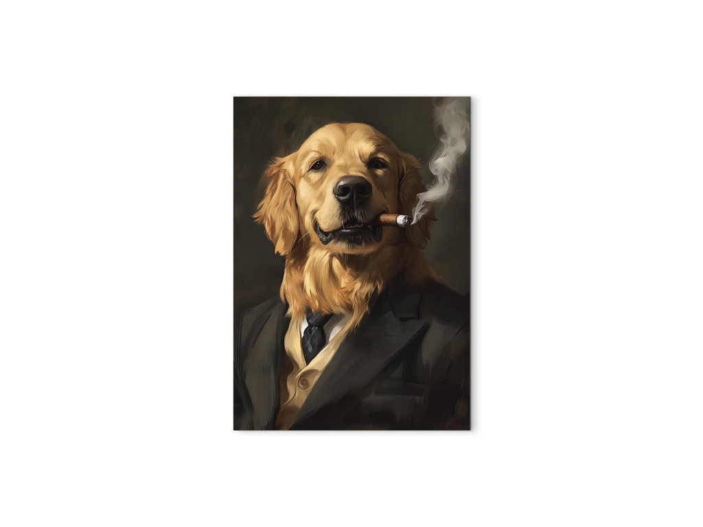 Golden retriever charismatique est le portrait d'un chien en costume élégant qui savoure un cigare avec le sourire et semble particulièrement satisfait de la vie. Son expression pleine de sérénité et de charme est complétée par des vêtements élégants et l'atmosphère paisible du tableau, qui met immédiatement de bonne humeur. Ce tableau original est le complément idéal d'un intérieur moderne, en particulier pour les amateurs de chiens, d'humour et d'art avec de la personnalité.