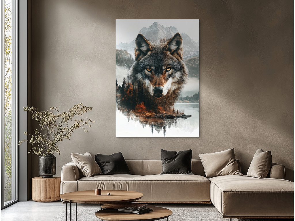 L'âme sauvage du loup est un tableau visuellement impressionnant dans lequel le loup majestueux fait partie intégrante de la nature elle-même. Ses yeux jaunes perçants regardent vers l'avant, tandis que son pelage révèle le paysage : sommets enneigés, forêts denses de conifères et lac tranquille reflétant le ciel. Le reflet sous le loup renforce le lien entre l'animal et le monde naturel, comme s'il incarnait le paysage qu'il protège. L'image est à la fois symbolique, paisible et puissante, rappelant l'unité entre la nature et son esprit sauvage.
