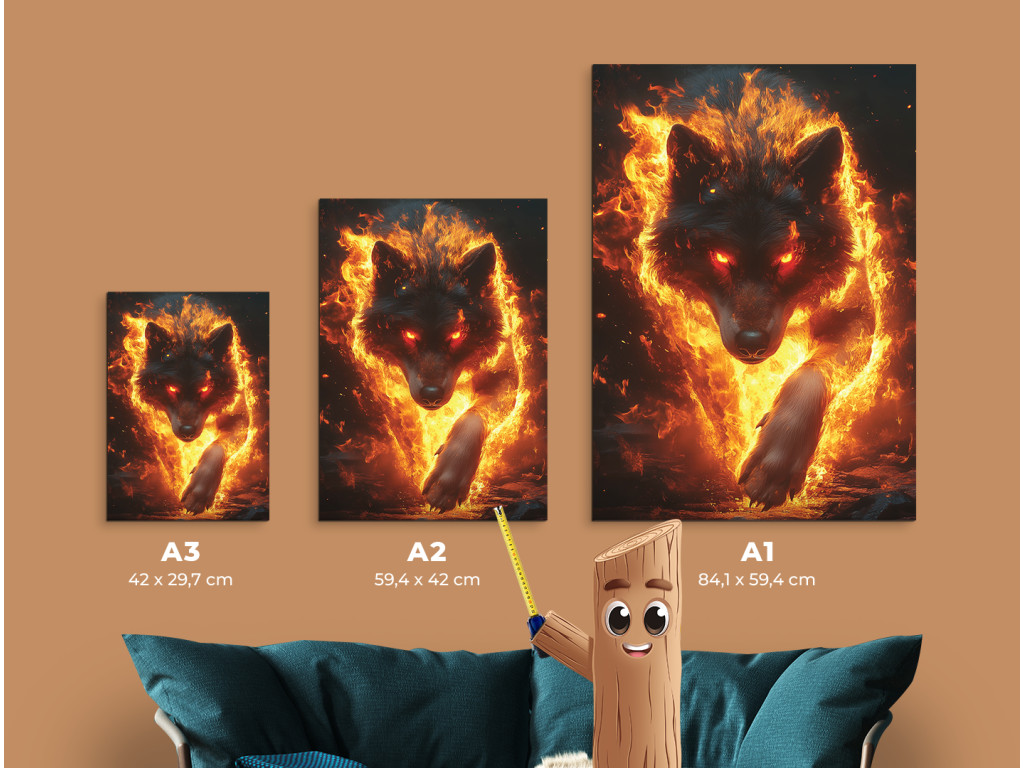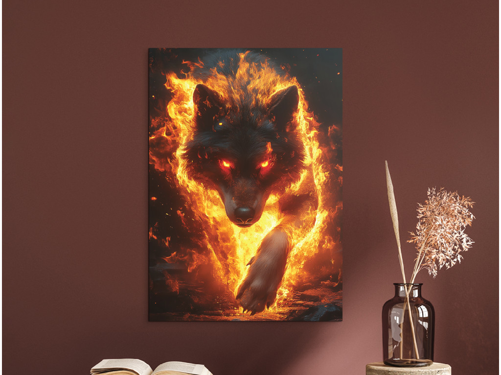La flamme de la bête est une image captivante représentant un loup-garou aux yeux de feu émergeant de flammes peintes de manière réaliste. Sa silhouette se détache sur un arrière-plan sombre empreint de tension et de danger. Ses yeux brillent comme des braises ardentes, tandis que les flammes entourent son corps, symbolisant transformation, colère et puissance déchaînée. Ce tableau est idéal pour les amateurs de fantasy, de mythes et d'énergie sombre.
