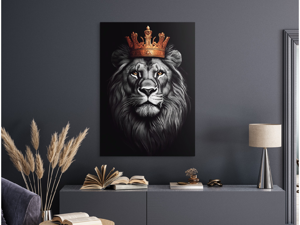 Le roi couronné est un portrait impressionnant d'un lion avec une couronne dorée majestueuse, incarnant dignité, force et sérénité. Le regard fier du lion, le contraste entre les nuances de gris et de noir de sa crinière et la couronne dorée brillante créent un visuel à la fois dramatique et élégant. Le fond sombre renforce l'intensité de l'expression et fait de cette image un élément central exceptionnel dans n'importe quel espace. Idéal pour un intérieur qui recherche l'équilibre entre force et noblesse.