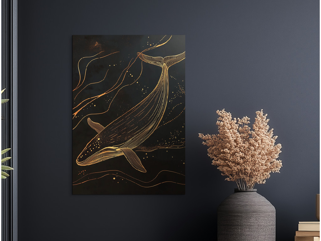 La profondeur dorée est un tableau minimaliste qui représente la silhouette d'une baleine dorée nageant dans l'obscurité de l'océan. Le fond noir évoque une profondeur infinie, tandis que la ligne dorée du corps de la baleine rayonne de calme, d'élégance et de mysticisme. Le tableau dégage une impression de pureté et de force – un complément idéal pour un intérieur moderne à la recherche de calme et de symbolisme dans la simplicité.