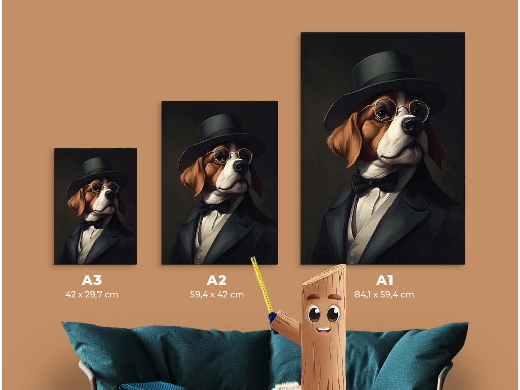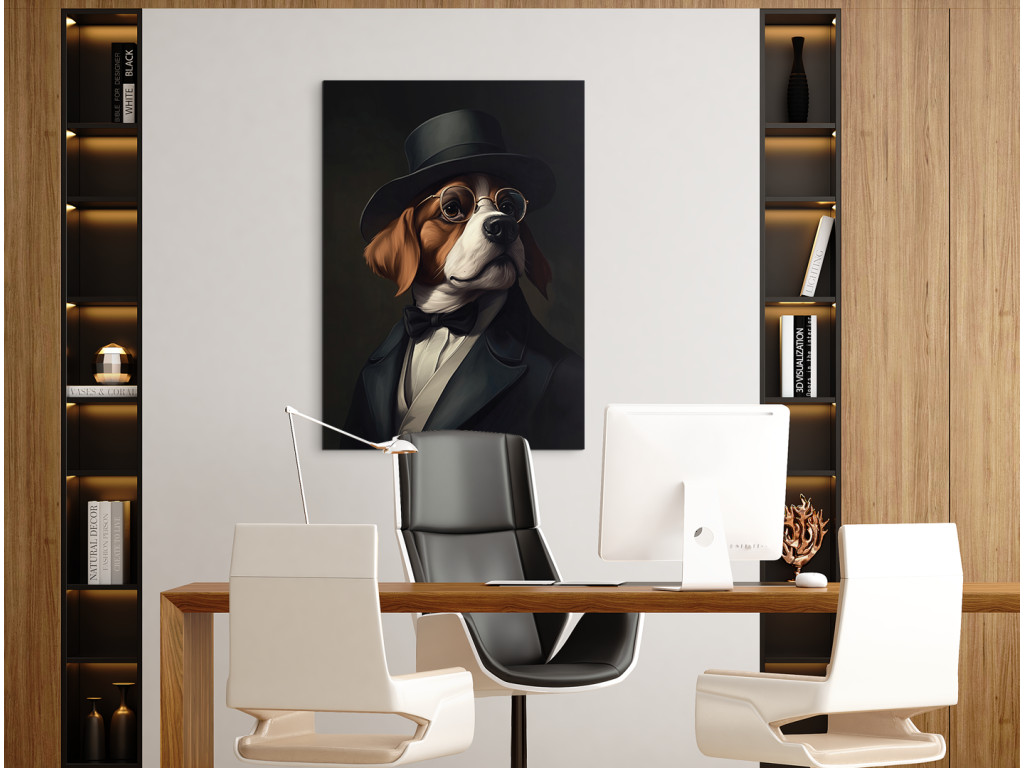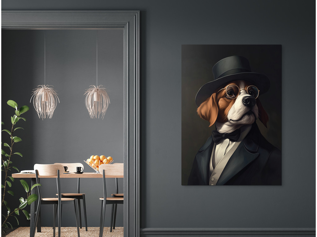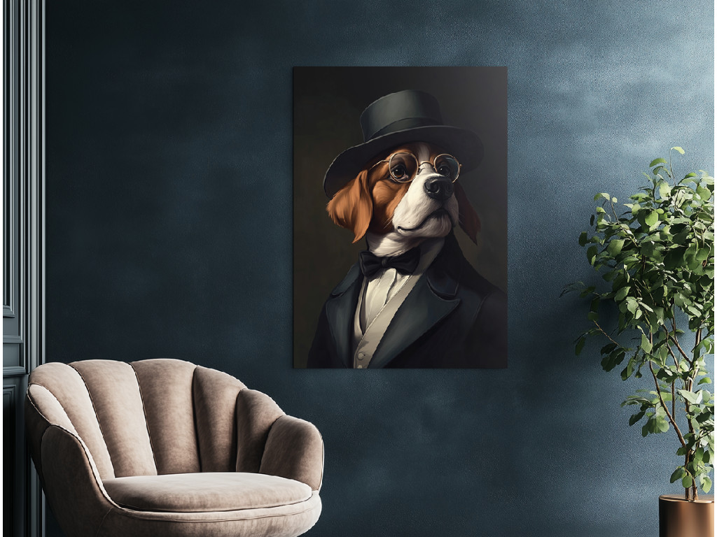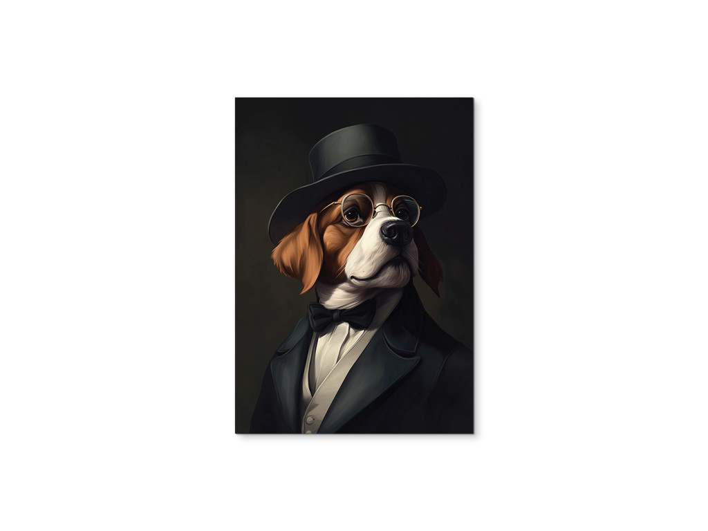 Le gentleman beagle est un charmant portrait d'un beagle représenté comme un gentleman victorien au goût raffiné. Dans son costume sombre, avec son nœud papillon noir, son chapeau haut-de-forme et ses lunettes rondes, il a l'air sérieux, mais avec l'expression irrésistiblement douce typique de cette race. La réalisation artistique confère à l'image le charme d'un portrait classique avec une touche d'humour – un complément idéal pour les amateurs de chiens, de style et de douce ironie britannique.
