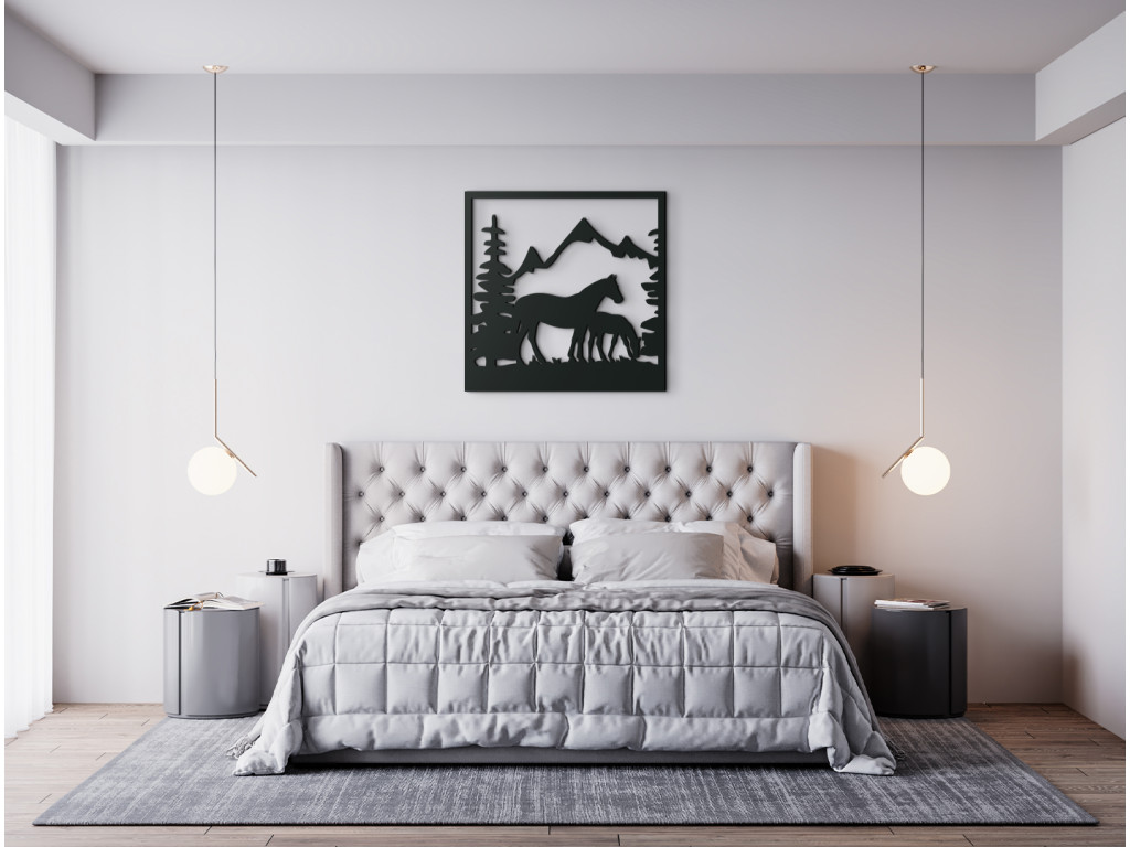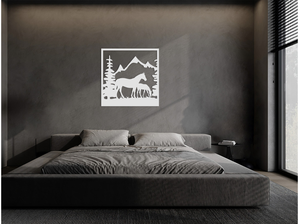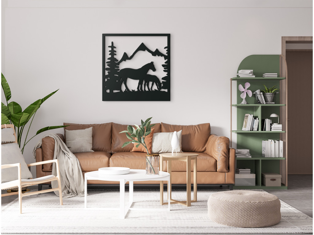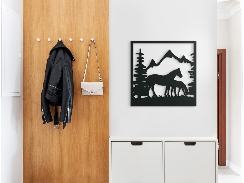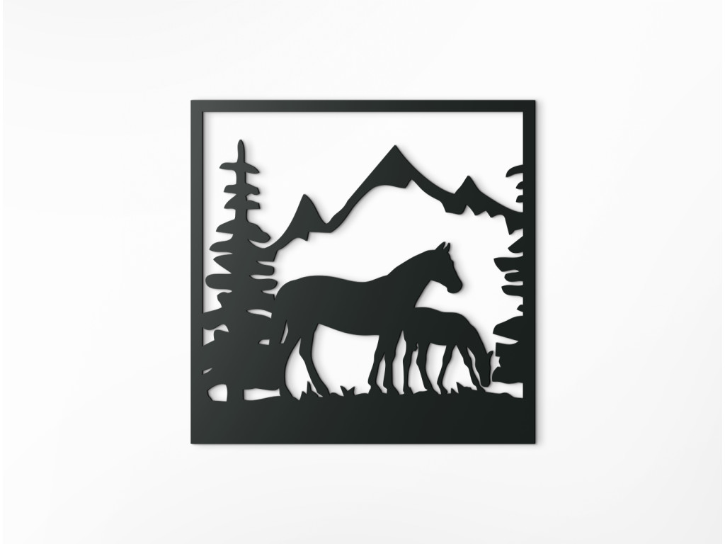 Vyrezávaný obraz na stenu Kobyla so žriebätkom dokonale vynikne v obývačke, spálni, v pracovni i v predsieni. Dekorácia znázorňuje siluetu kobyly a jej žriebätka, ako sa pasú na pasienku olemovanom stromami. Na pozadí sa črtajú majestátne končiare zasnežených hôr.