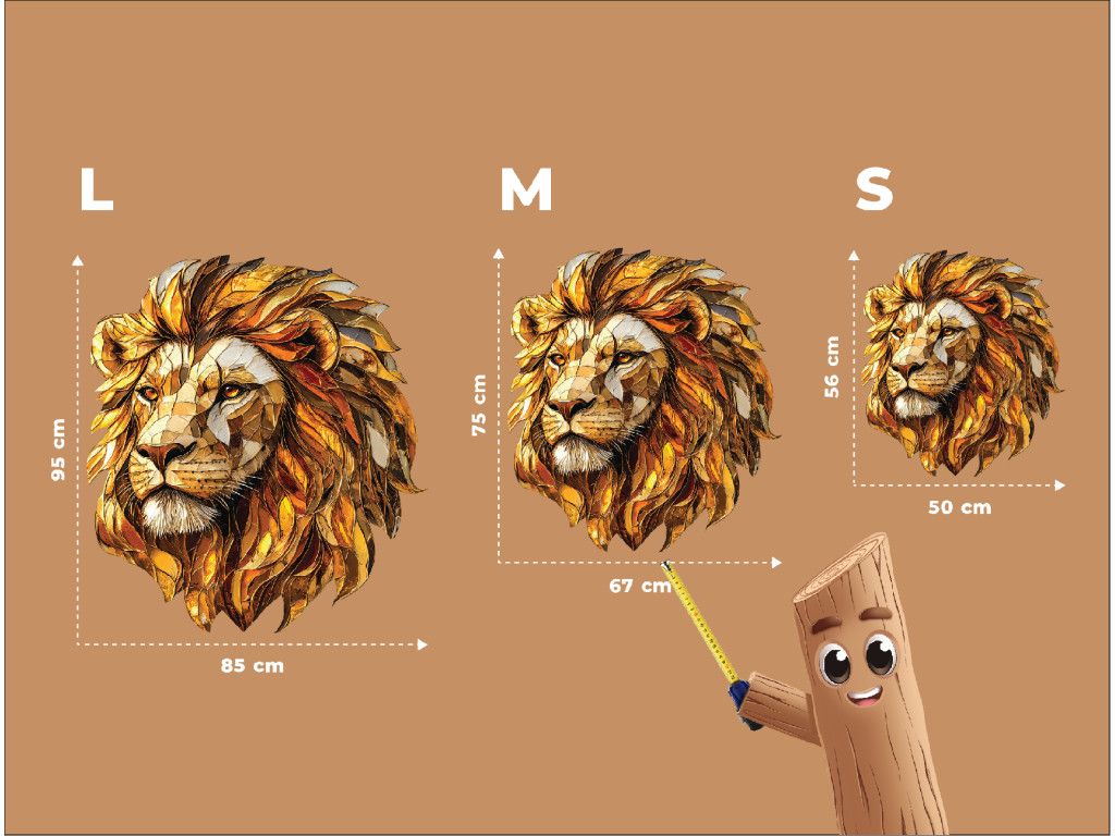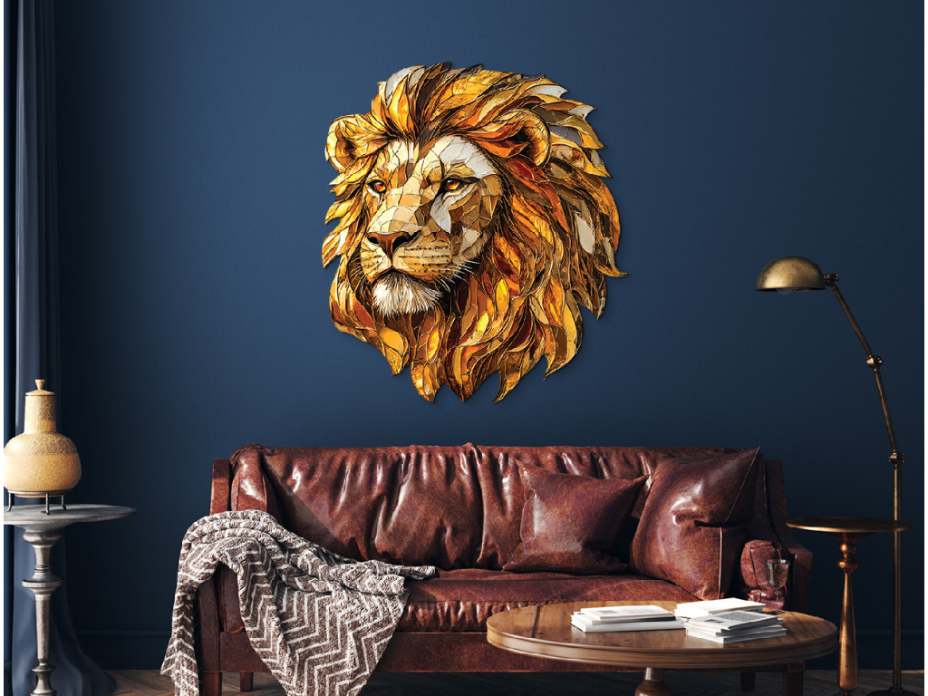 Ce tableau décoratif mural représente une tête de lion sous forme de mosaïque, où les différents éléments de la crinière dans des tons dorés et orange créent un effet riche et stratifié. La texture et les couleurs renforcent la majesté du lion et ajoutent à l'intérieur une touche artistique distinctive, empreinte de force et d'élégance.