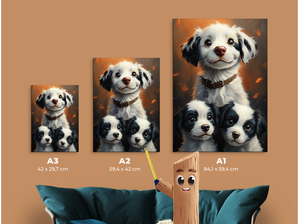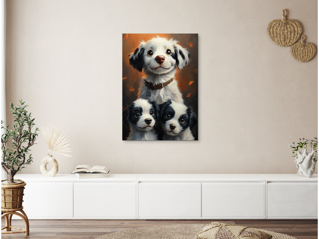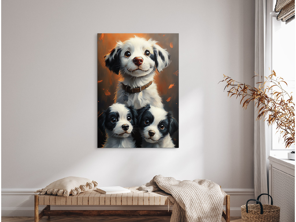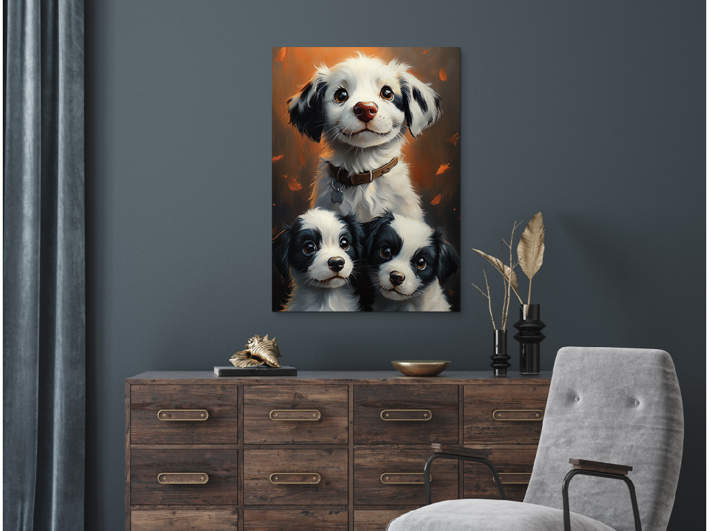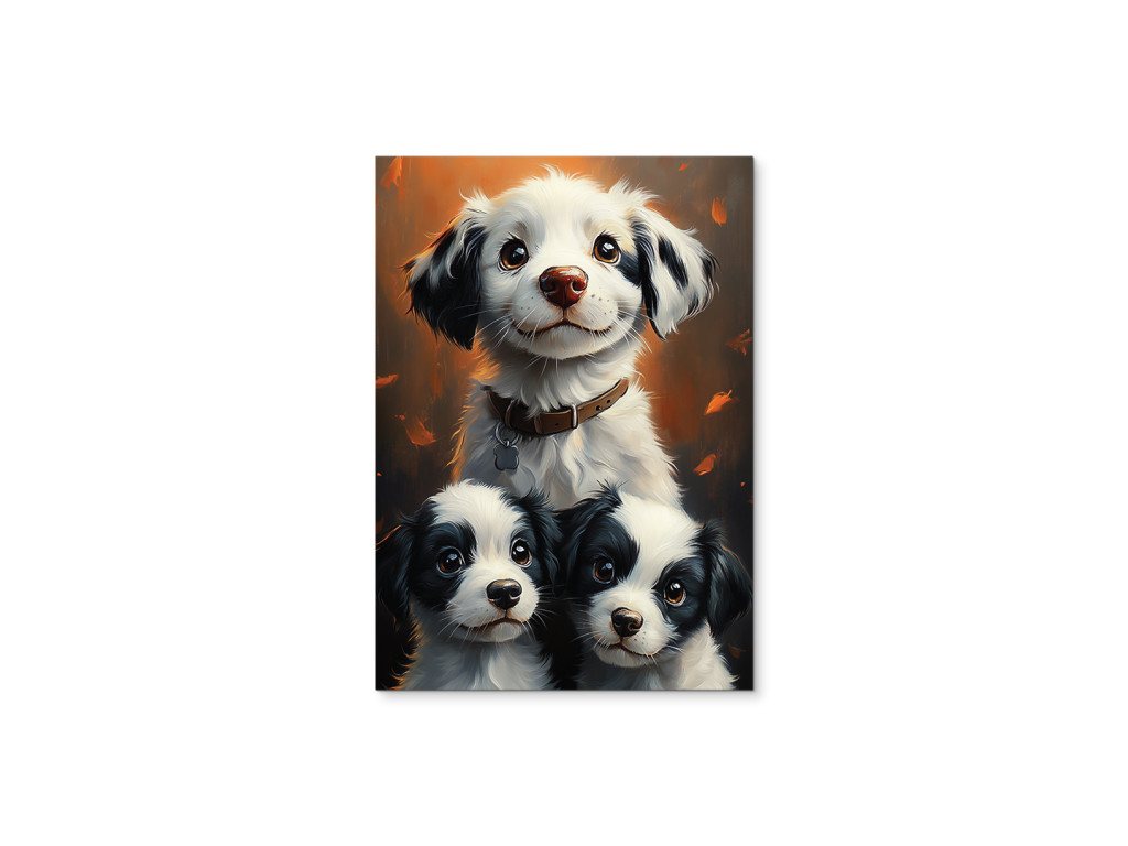 La joyeuse meute est un tableau joyeux et chaleureux qui représente une chienne au regard heureux et ses deux chiots espiègles. Il évoque un moment de joie, de paix et de bien-être familial, sous une forme canine – idéal pour les amoureux des animaux. Cette image égayera à merveille une chambre d'enfant, un couloir, une clinique vétérinaire ou tout autre espace où le sourire et la bonne humeur doivent régner.