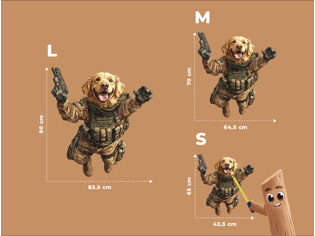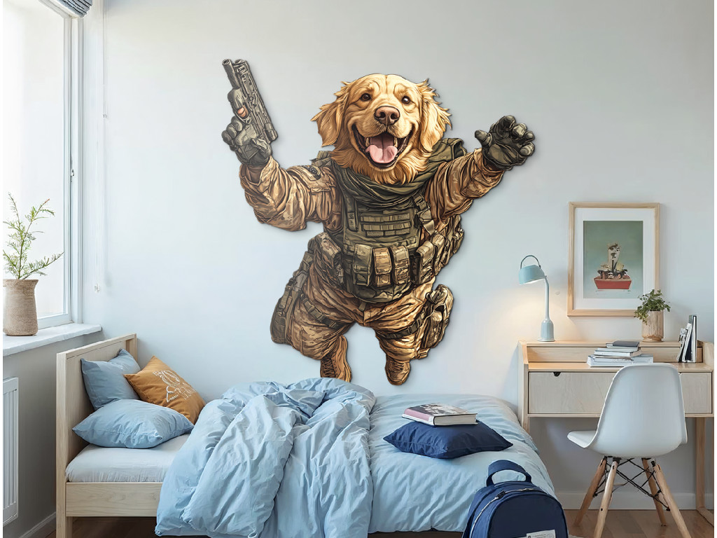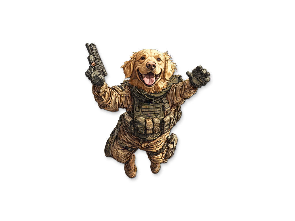 La représentation artistique d'un golden retriever en tenue tactique combine la loyauté et le charme de cette race avec des visuels d'intervention. Le motif rappelle, avec une touche d'humour, le rôle des chiens de travail dans les unités K9 et évoque le courage, l'intelligence et l'esprit d'équipe.