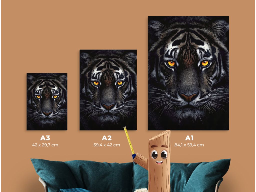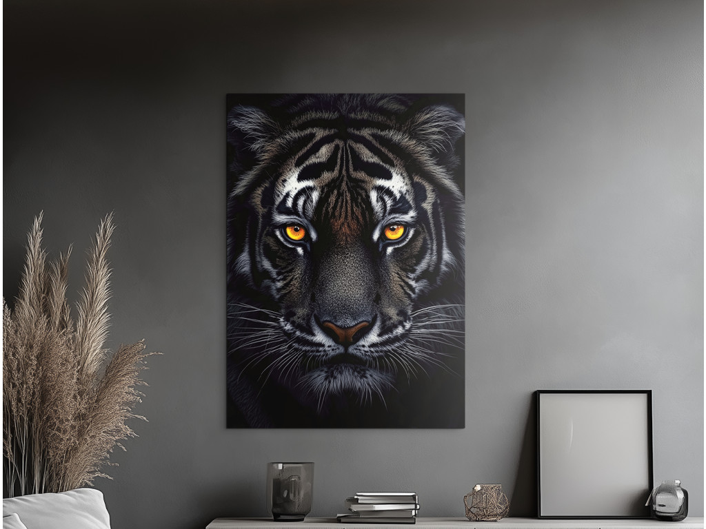 L'ombre du prédateur capture le regard intense d'un tigre caché dans l'obscurité. Seule sa tête ressort du tableau, plongée dans l'ombre, avec pour seule source de lumière ses yeux perçants et brillants. L'atmosphère est tendue et hypnotique, comme si le félin observait sa proie dans un silence absolu. Ce tableau dégage le respect, la force et l'autorité naturelle du tigre, née de l'obscurité et de la concentration.