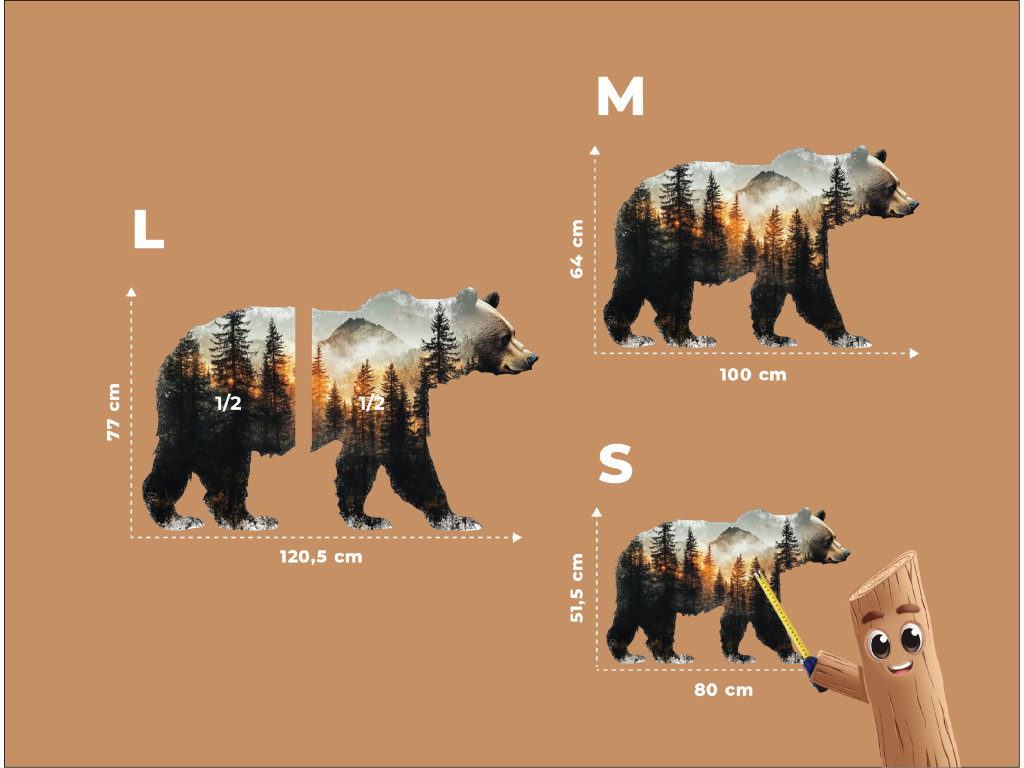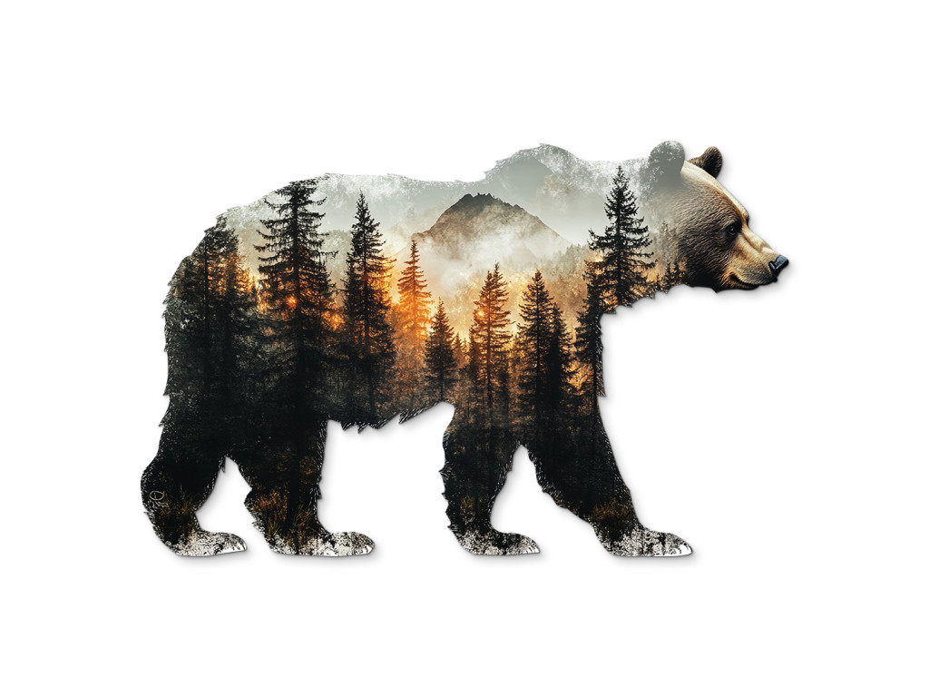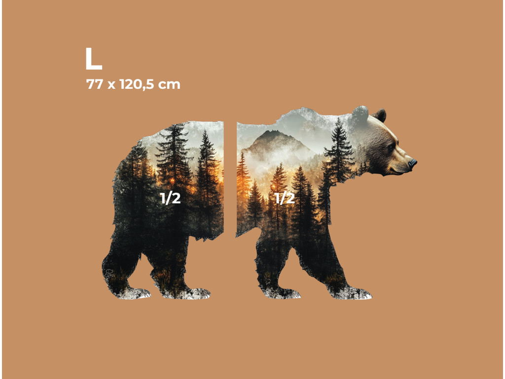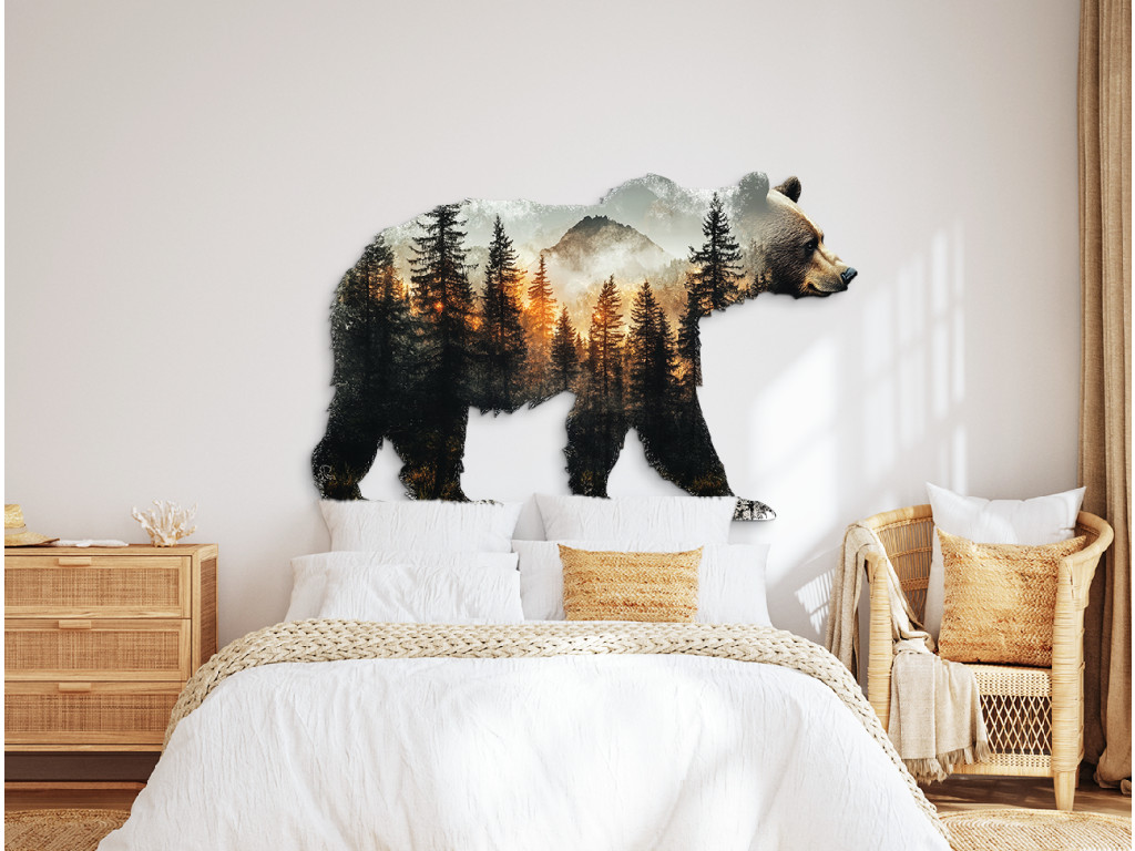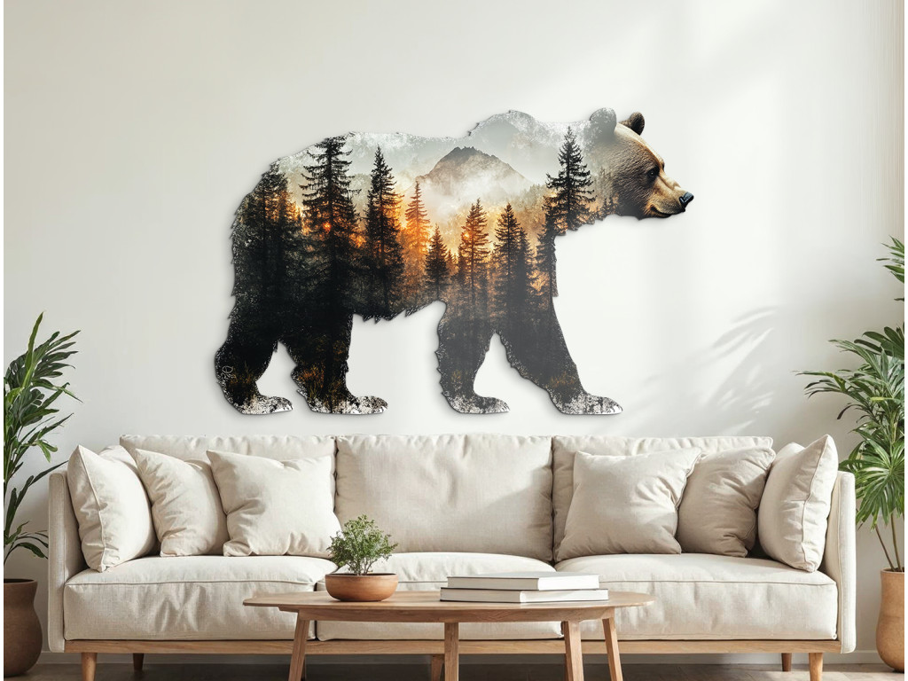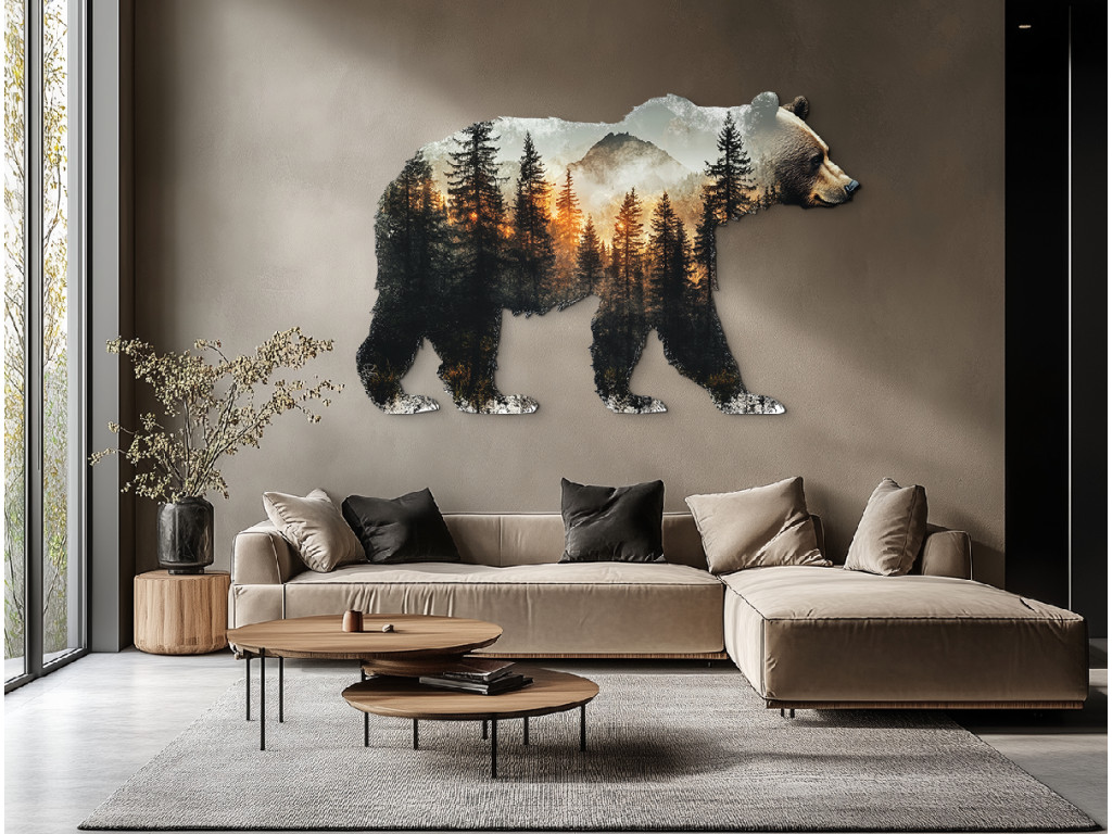 La décoration murale en forme de silhouette d'ours allie la majesté de la nature sauvage à l'expression artistique. À l'intérieur de la forme s'étend un paysage forestier paisible avec des conifères, des montagnes et la lumière chaude du coucher ou du lever du soleil. Ce motif naturel apporte harmonie, force et connexion avec la nature sauvage à l'espace.
