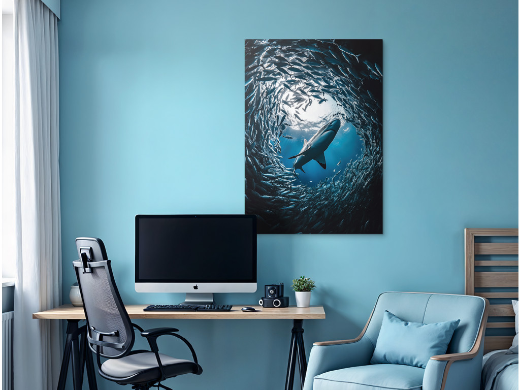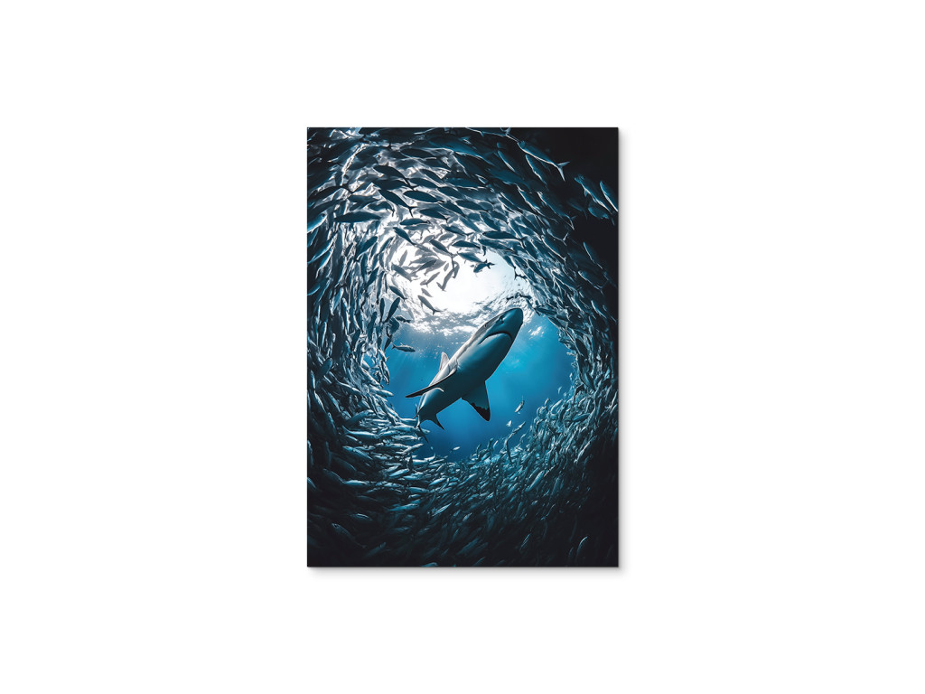 Le maître des profondeurs est une image sous-marine captivante représentant un requin nageant au milieu d'un immense banc de poissons tourbillonnant autour de lui comme un vortex vivant. La lumière qui pénètre depuis la surface crée des rayons dramatiques qui soulignent le dynamisme et la tension de la scène. Calme et puissant, le requin est le centre visuel et symbolique de la composition, incarnant la force, le calme et le contrôle dans le chaos.