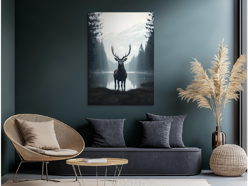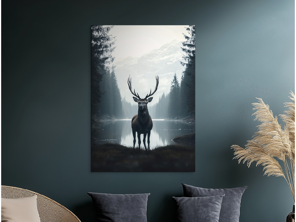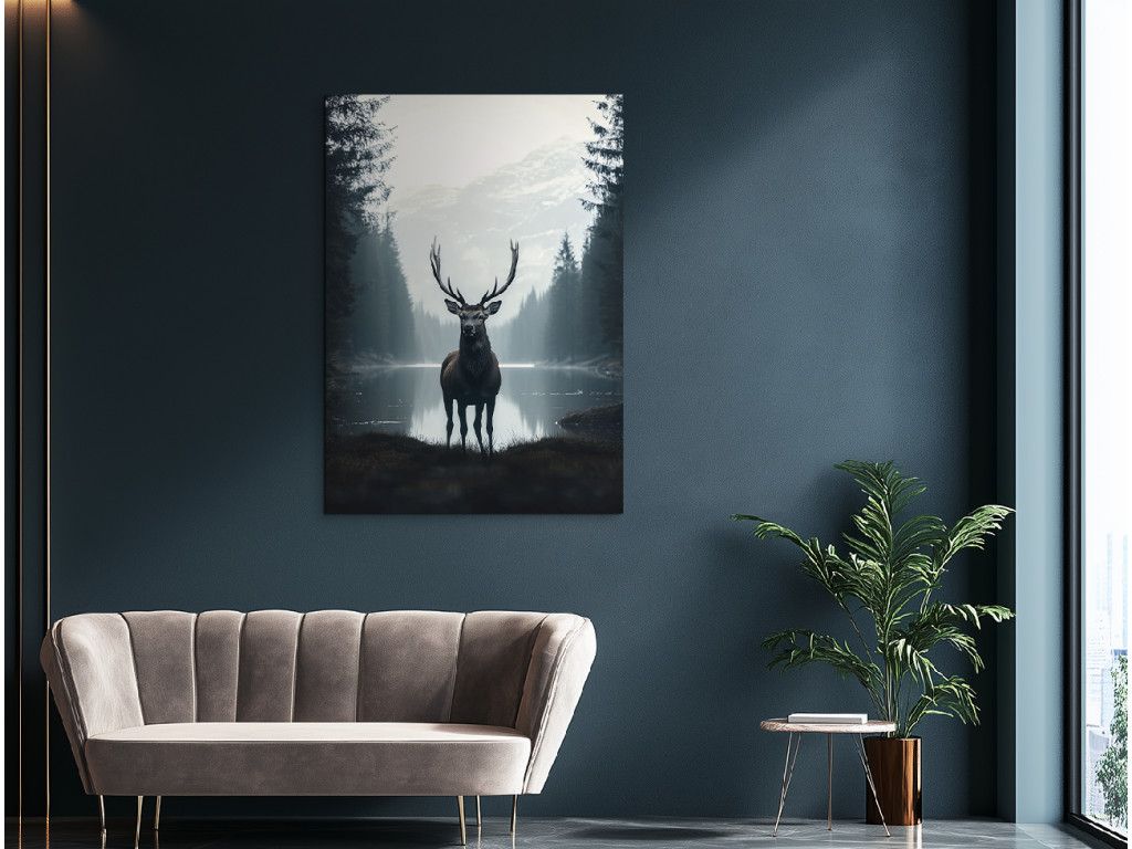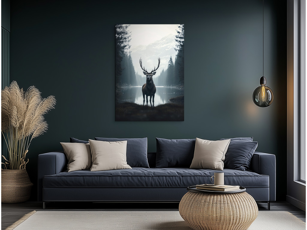 Le silence du lac froid est un tableau réaliste qui capture un cerf imposant debout au premier plan près d'un lac calme et froid, entouré par la nature. Le reflet sur l'eau, la lumière douce et le dessin détaillé créent un sentiment de présence réelle et d'harmonie avec l'environnement. Le tableau dégage une impression à la fois paisible et forte, idéale pour un intérieur qui aspire à se connecter avec la nature sauvage et la tranquillité des paysages nordiques.
