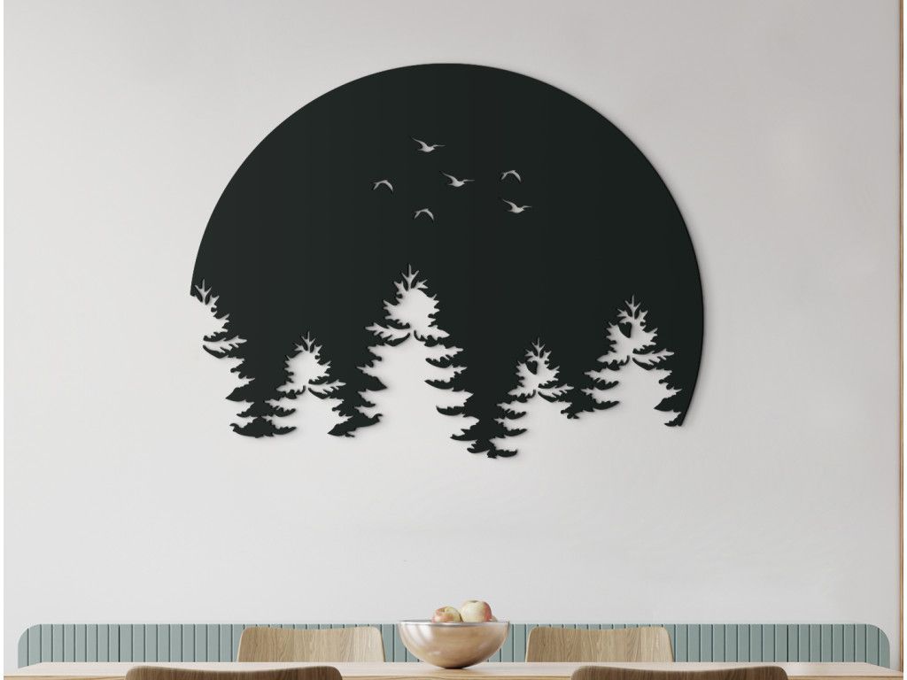 Pre milovníkov prírody máme originálnu dekoráciu na stenu. Vyobrazenie lesa nad ktorým letí kŕdeľ vtákov sa bude hodiť do moderných priestorov. Zaujímavým detailom sa stáva absentujúci spodný rám, ktorý nahrádzajú stromy.