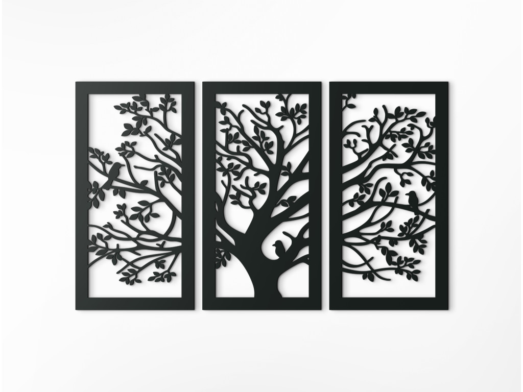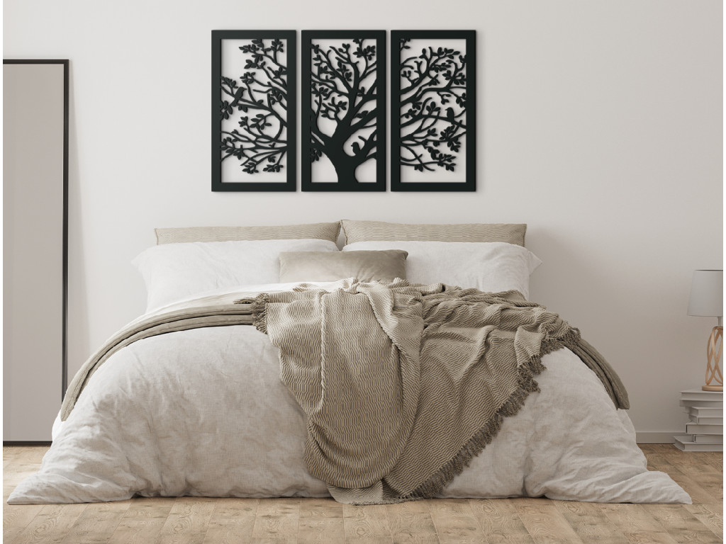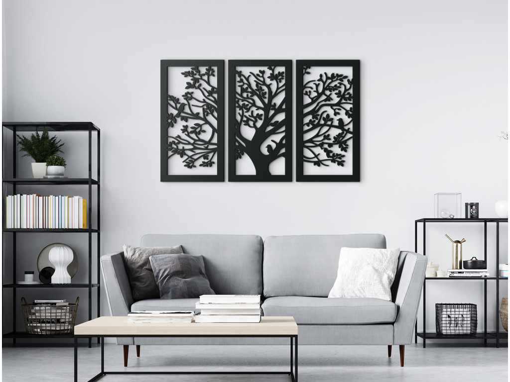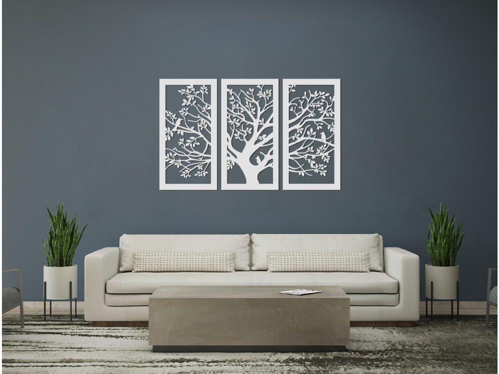Drevený obraz Strom je dekoráciou vhodnou do každého interiéru. Je vyskladaný z 3 dielov na seba nadväzujúcich. Stredný diel spolu s pravou a ľavou stranou vytvára dizajnový kúsok do všetkých miestností. Na každom z dielov sa nachádzaj kúsok z veľkého stromu. Jemnosť dopĺňajú tri spievajúce vtáčiky sediace na konároch. Obraz najlepšie vyznie, keď bude zavesený spolu ako jeden kus.