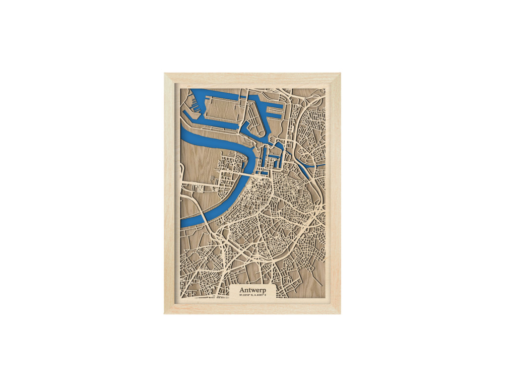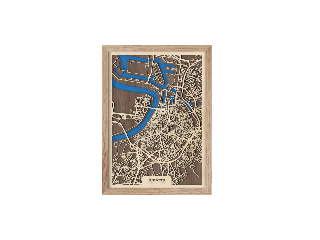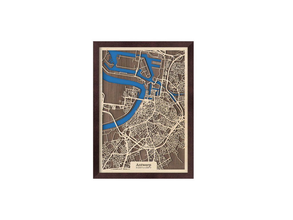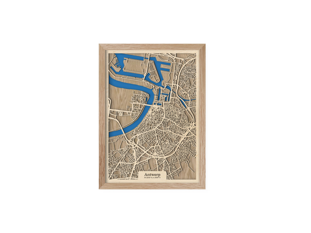 Na pravom brehu rieky Šelda a tiež v našej kolekcii drevko CITY sa vyníma najväčšie mesto Belgicka a druhý najväčší prístav Európy. Ak ste si Rubensovo mesto či Jeruzalem západu obľúbili, drevená mapa Antverpy vás bude tešiť pohľadom naň z vtáčej perspektívy každý deň. Zachytáva historické centrum a štvrte od Eilandje, Dam, Seefhoek cez Theaterbuurt, Merksem, Deurne, Borgerhout, Berchem až po Wilrijk aj Hoboken. Dokonalý 3D efekt mapy dopĺňajú modré vodné plochy a rám v 4 dostupných farbách.