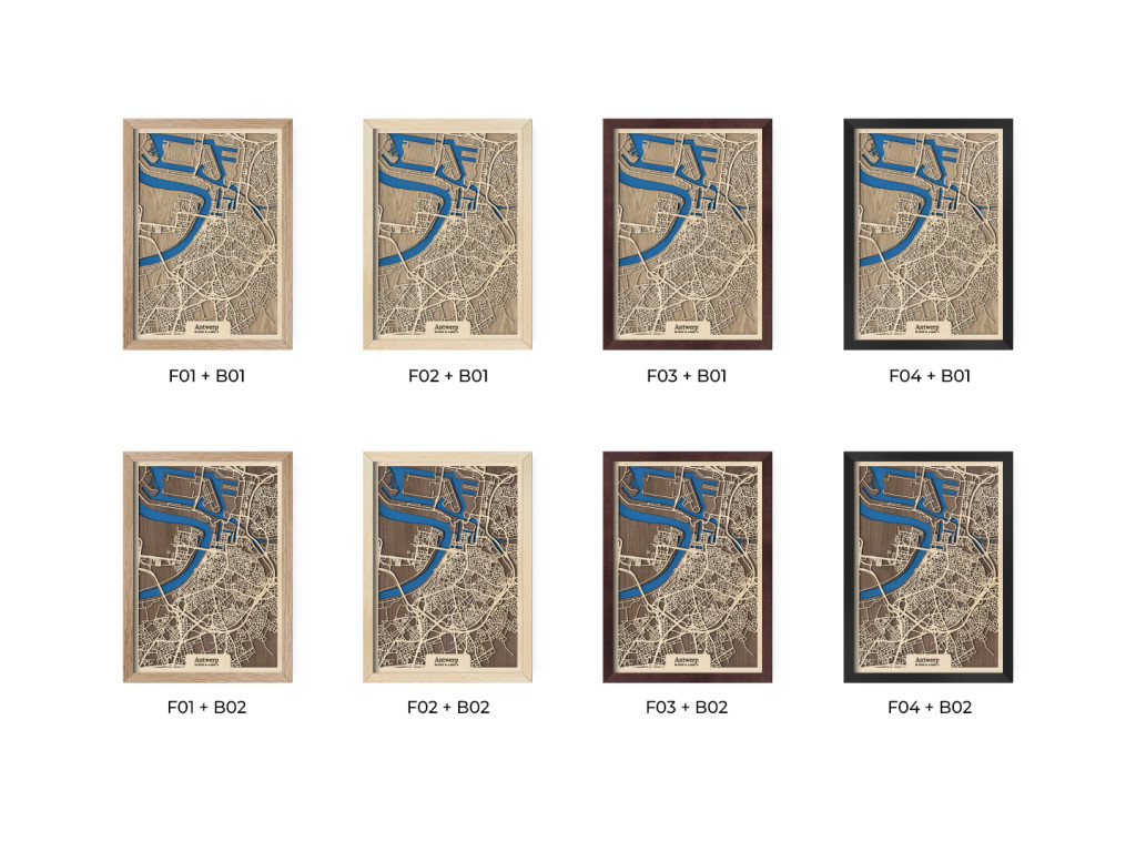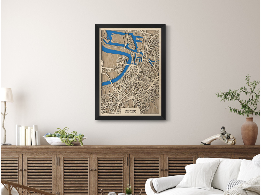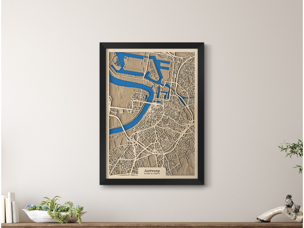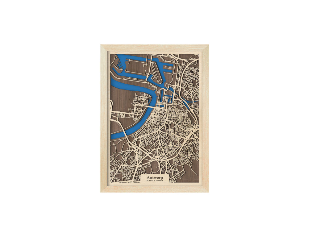 Na pravom brehu rieky Šelda a tiež v našej kolekcii drevko CITY sa vyníma najväčšie mesto Belgicka a druhý najväčší prístav Európy. Ak ste si Rubensovo mesto či Jeruzalem západu obľúbili, drevená mapa Antverpy vás bude tešiť pohľadom naň z vtáčej perspektívy každý deň. Zachytáva historické centrum a štvrte od Eilandje, Dam, Seefhoek cez Theaterbuurt, Merksem, Deurne, Borgerhout, Berchem až po Wilrijk aj Hoboken. Dokonalý 3D efekt mapy dopĺňajú modré vodné plochy a rám v 4 dostupných farbách.
