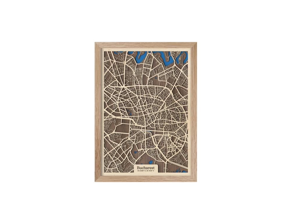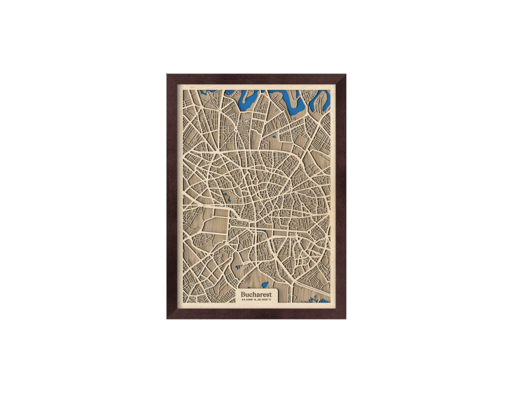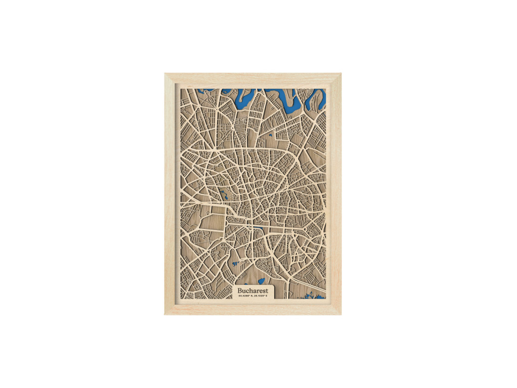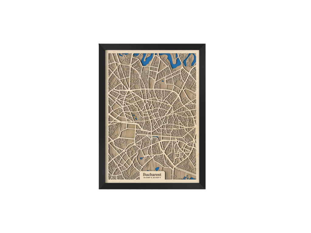 Vedeli ste, že hlavné mesto Rumunska je známe aj pod prezývkou Paríž Východu? Nečudo, miestnym aj turistom totiž učaruje historickým centrom, noblesnou architektúrou, zelenými parkami a záhradami, palácmi, múzeami a dokonca aj víťazným oblúkom. Drevený obraz Bukurešť z kolekcie drevko CITY zachytáva mesto a časti jeho 6 sektorov z vtáčej perspektívy. Od jazier na severe cez Centrul Vechi až po Tineretului. 3D mapa Bukurešti je dostupná v 2 veľkostiach a 4 farbách rámu.