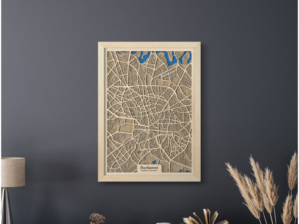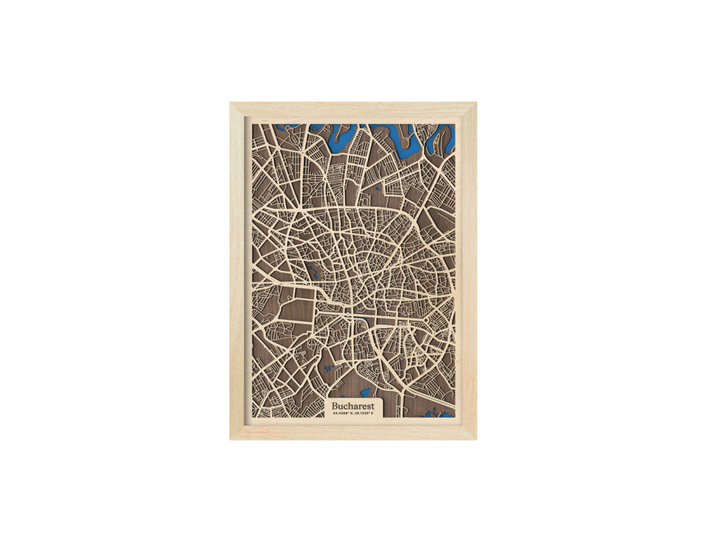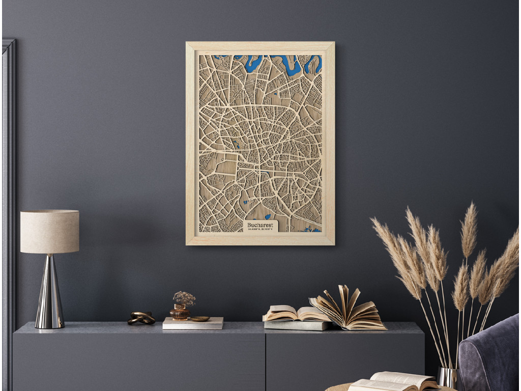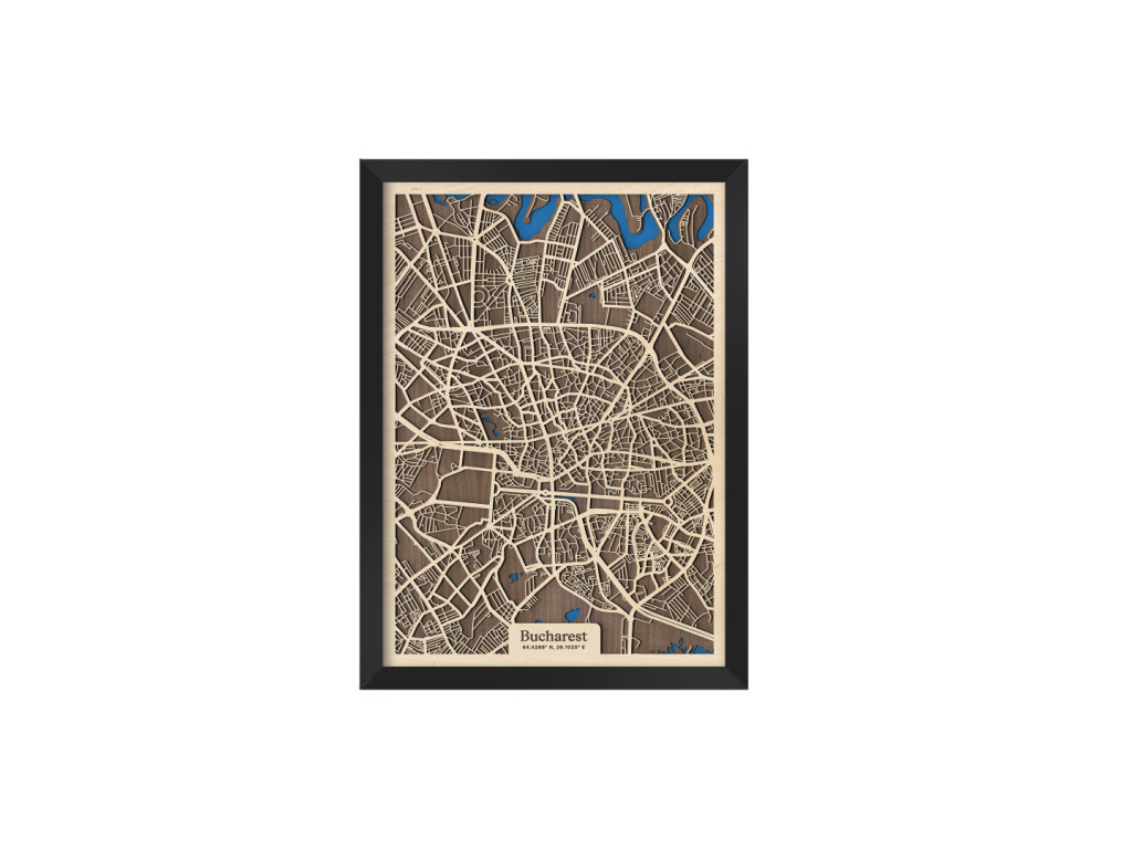 Vedeli ste, že hlavné mesto Rumunska je známe aj pod prezývkou Paríž Východu? Nečudo, miestnym aj turistom totiž učaruje historickým centrom, noblesnou architektúrou, zelenými parkami a záhradami, palácmi, múzeami a dokonca aj víťazným oblúkom. Drevený obraz Bukurešť z kolekcie drevko CITY zachytáva mesto a časti jeho 6 sektorov z vtáčej perspektívy. Od jazier na severe cez Centrul Vechi až po Tineretului. 3D mapa Bukurešti je dostupná v 2 veľkostiach a 4 farbách rámu.
