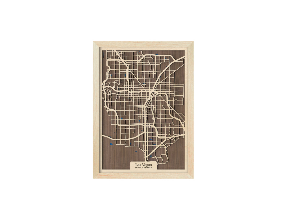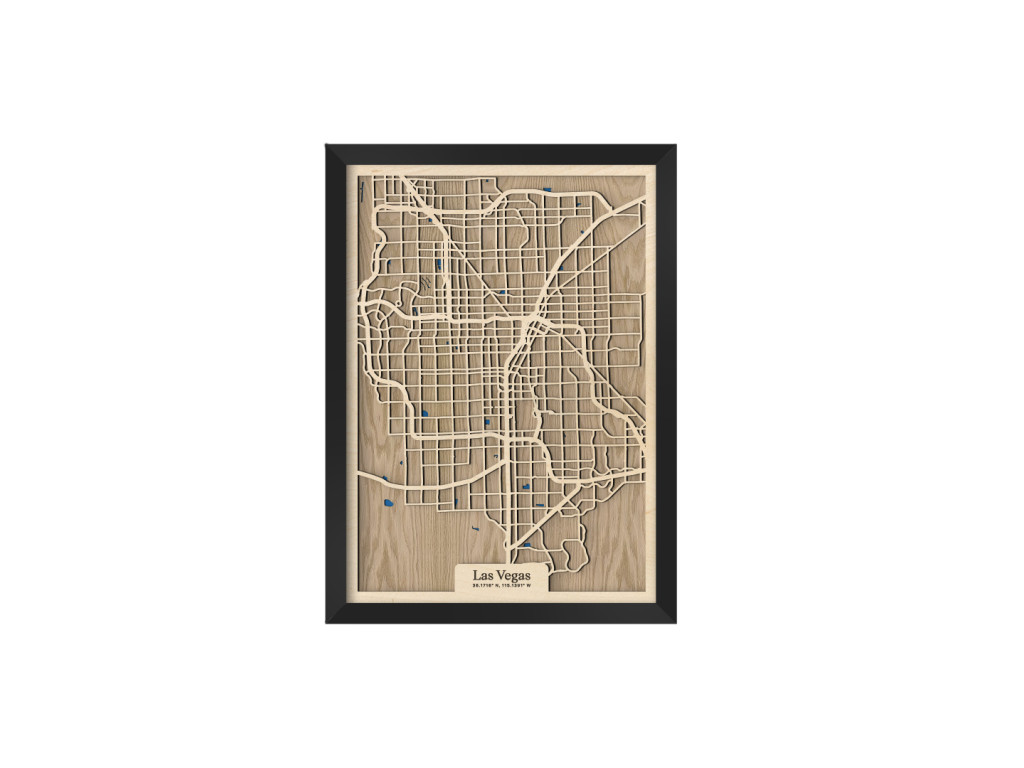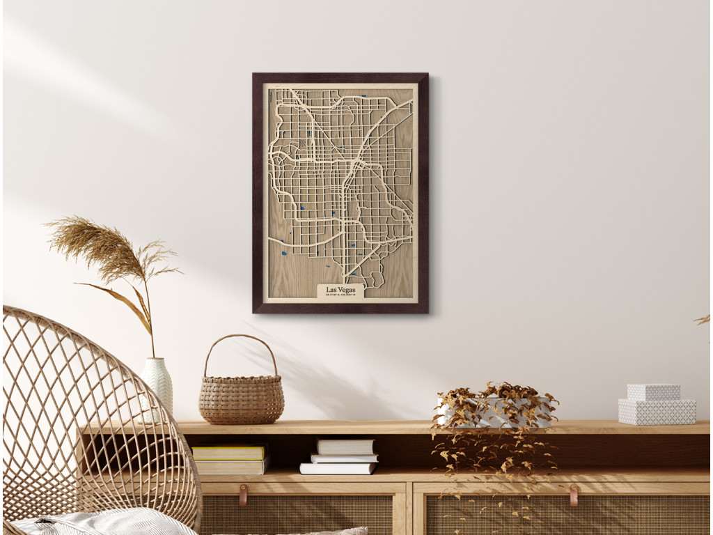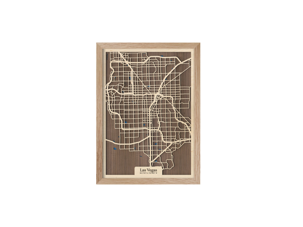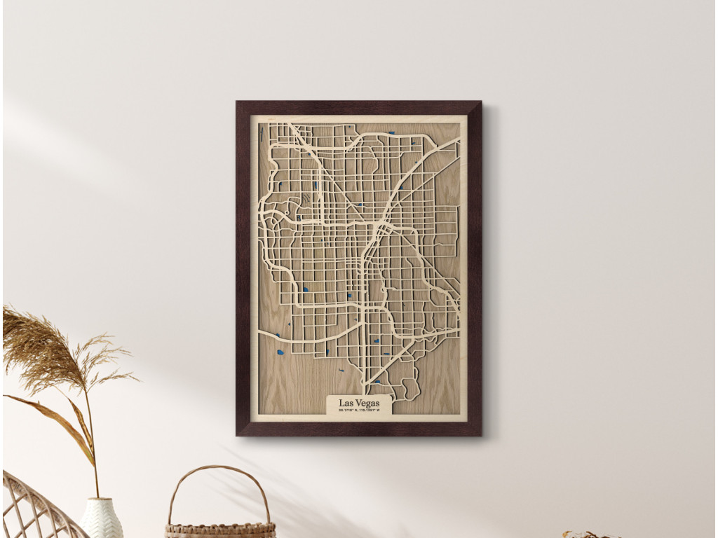 Viva Las Vegas! Mesto hazardu, svetiel a zábavy bolo vybudované uprostred Mohavskej púšte do pravouhlých ulíc, vďaka čomu má aj naša drevená mapa z kolekcie drevko CITY zaujímavý geometrický vzhľad. Dnes je najľudnatejším miestom v štáte Nevada, USA, ktoré tvoria časti Downtown, Las Vegas, slávna štvrť The Strip, North Las Vegas, Summerlin, Spring Valley, Paradise či Henderson. Obraz Las Vegas nevynecháva ani vodné plochy, ktoré sú značené modrou farbou a dotvárajú 3D efekt dekorácie.