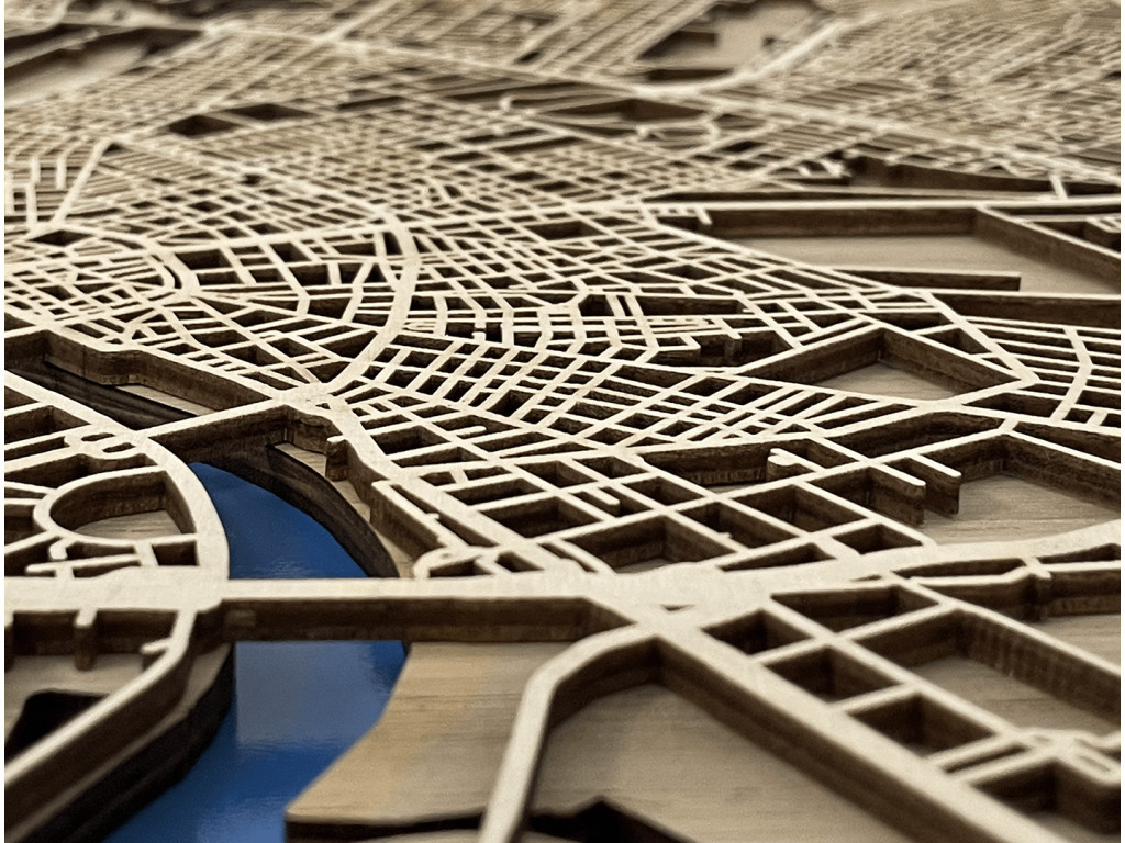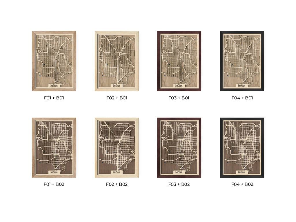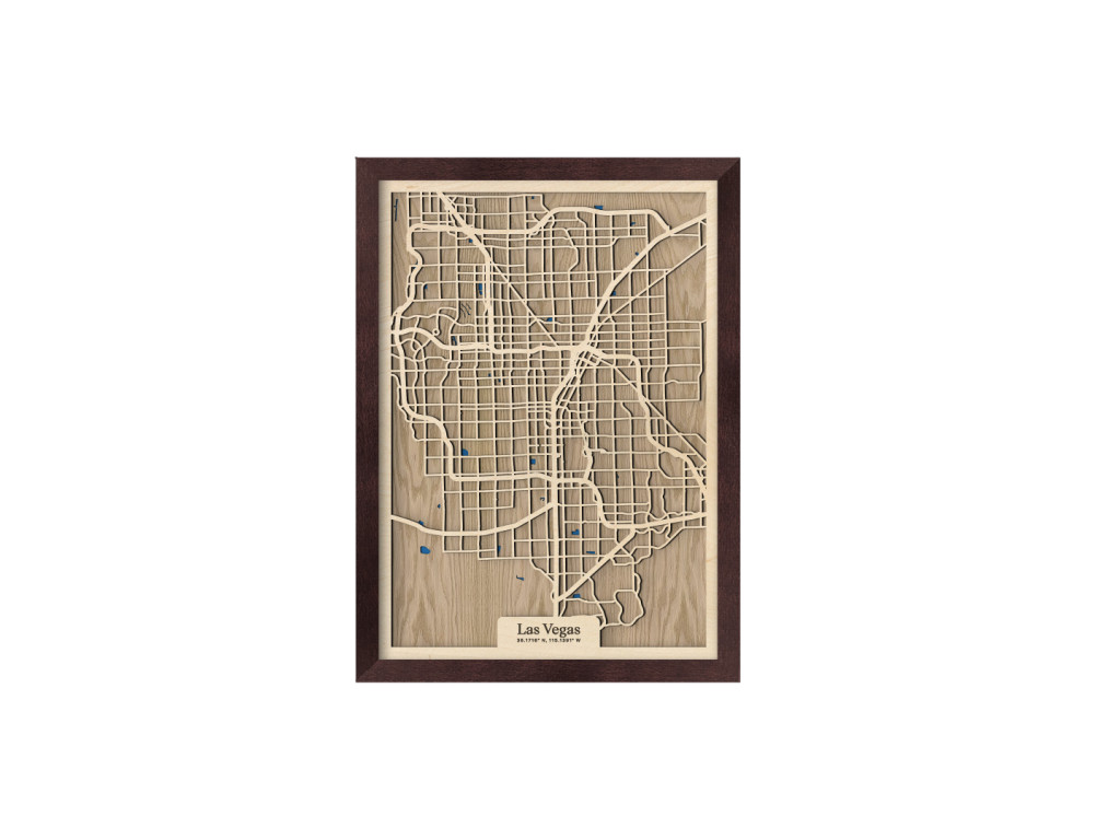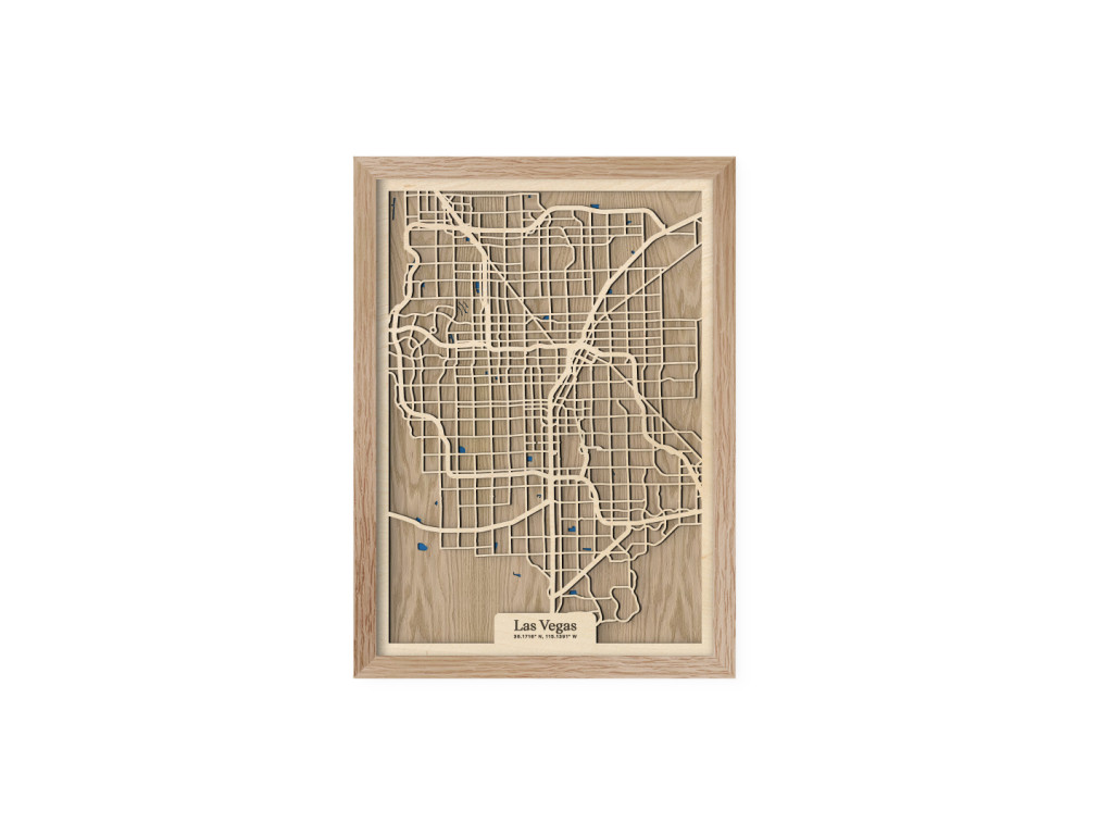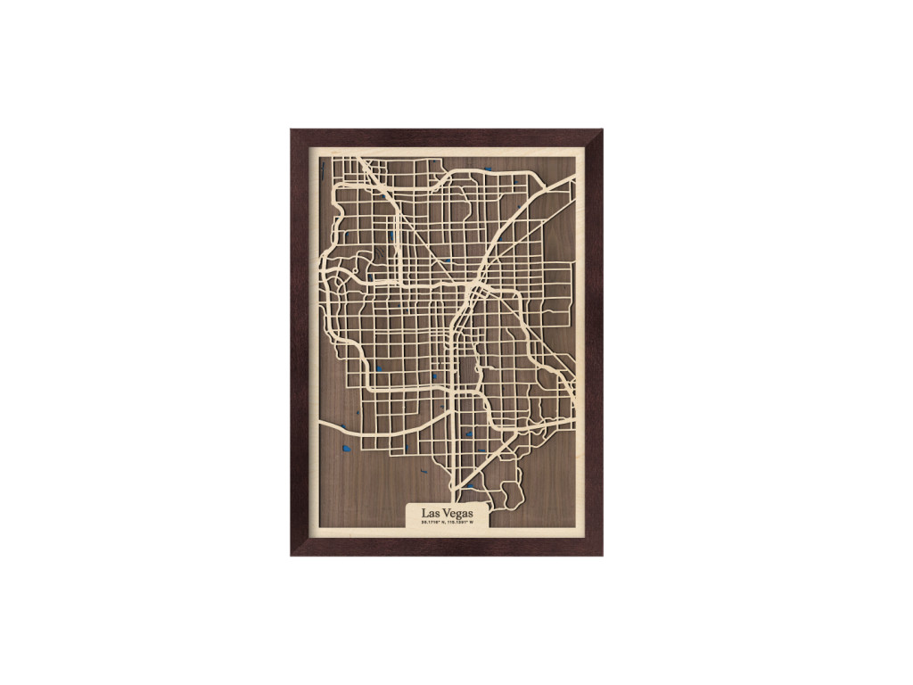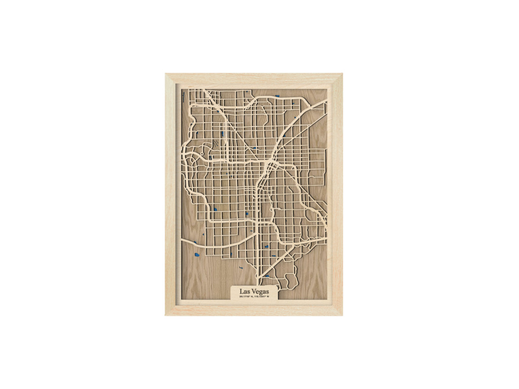 Viva Las Vegas! Mesto hazardu, svetiel a zábavy bolo vybudované uprostred Mohavskej púšte do pravouhlých ulíc, vďaka čomu má aj naša drevená mapa z kolekcie drevko CITY zaujímavý geometrický vzhľad. Dnes je najľudnatejším miestom v štáte Nevada, USA, ktoré tvoria časti Downtown, Las Vegas, slávna štvrť The Strip, North Las Vegas, Summerlin, Spring Valley, Paradise či Henderson. Obraz Las Vegas nevynecháva ani vodné plochy, ktoré sú značené modrou farbou a dotvárajú 3D efekt dekorácie.
