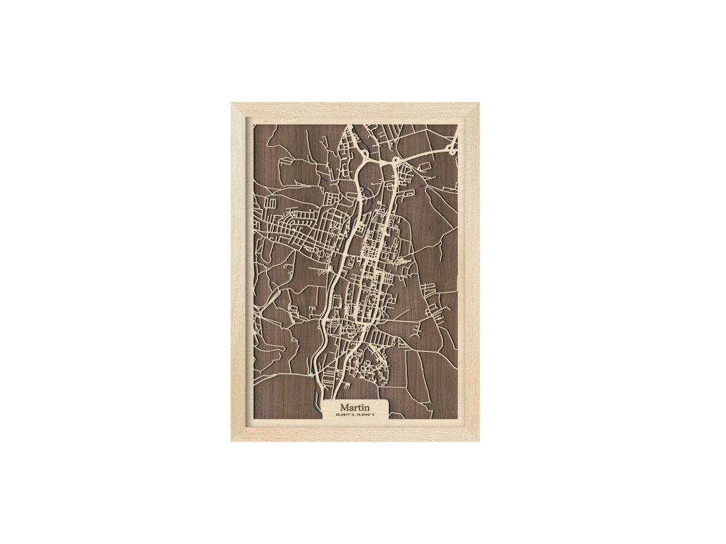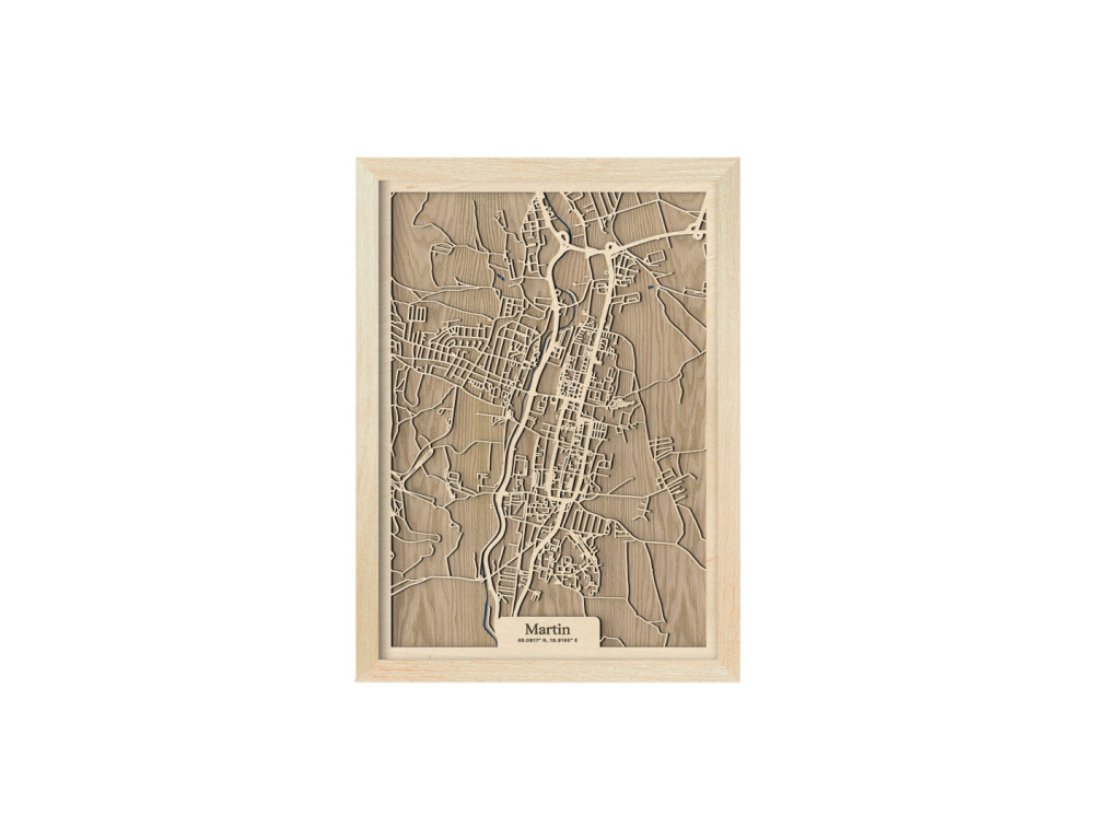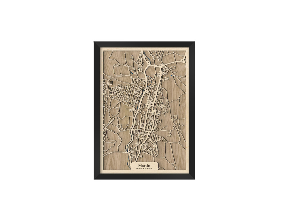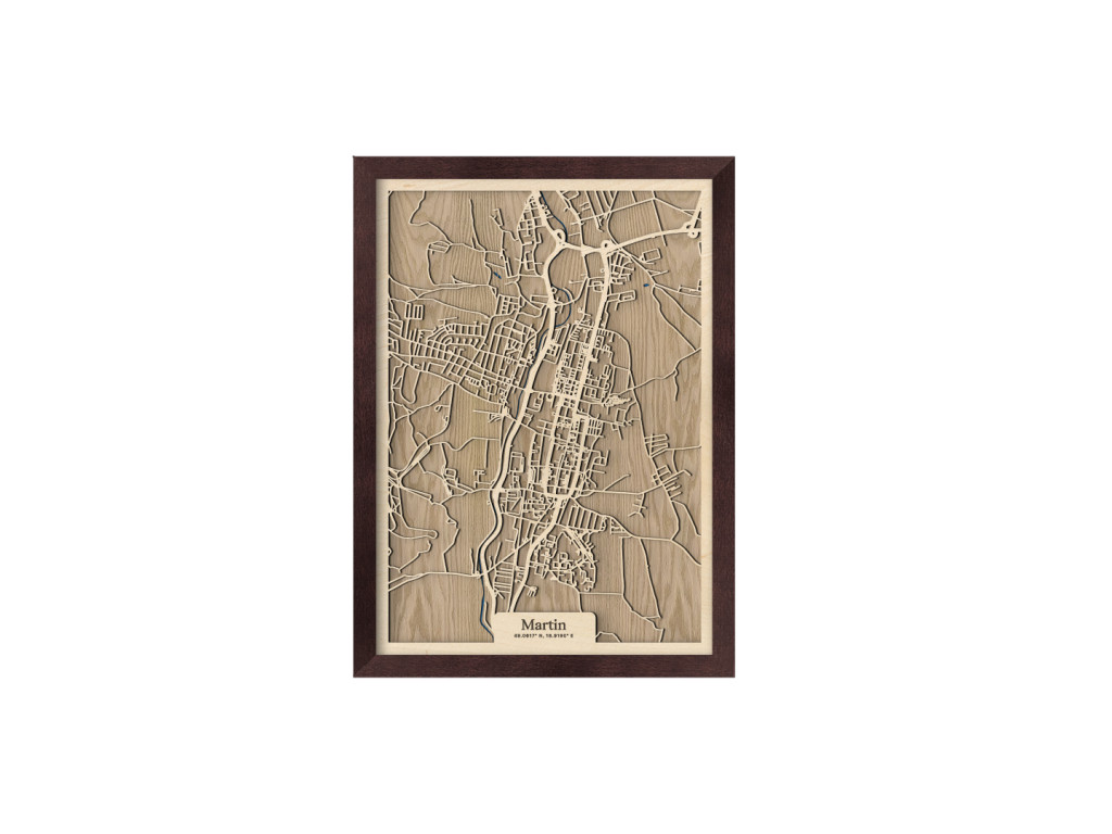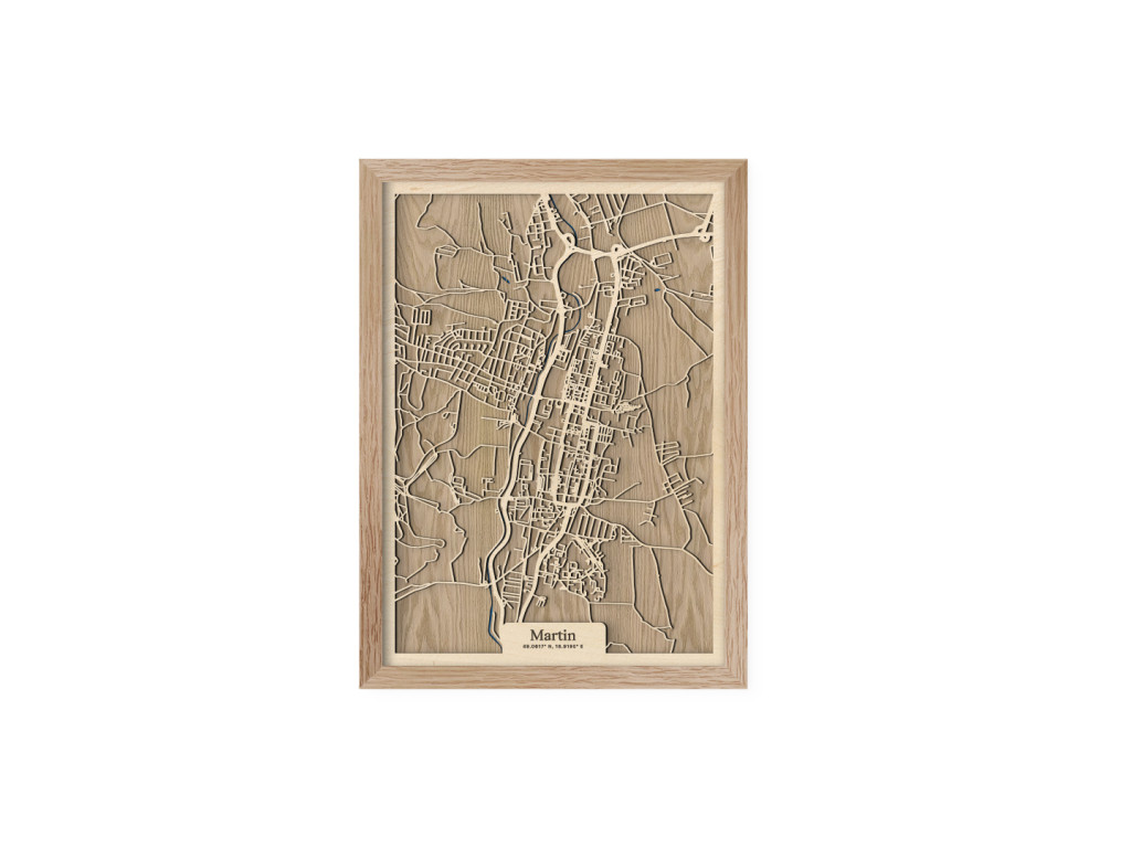Nečudo, že vám historické centrum Turca na severe Slovenska prirástlo k srdcu. Drevený obraz Martin sme zaradili do kolekcie drevko CITY nielen pre rodákov, ale aj návštevníkov. Tí miestni však určite spoznajú časti Priekopa, Záturčie, Košúty, Ľadoveň, Jahodníky, Tomčany, Stred, Sever či Podháj-Stráne. Hlavný ťah na mape lemuje modrá rieka Turiec presne tak ako v skutočnosti. Cesty a ulice Martina pre vás zvečníme vo farbách a rozmere podľa vašich predstáv.