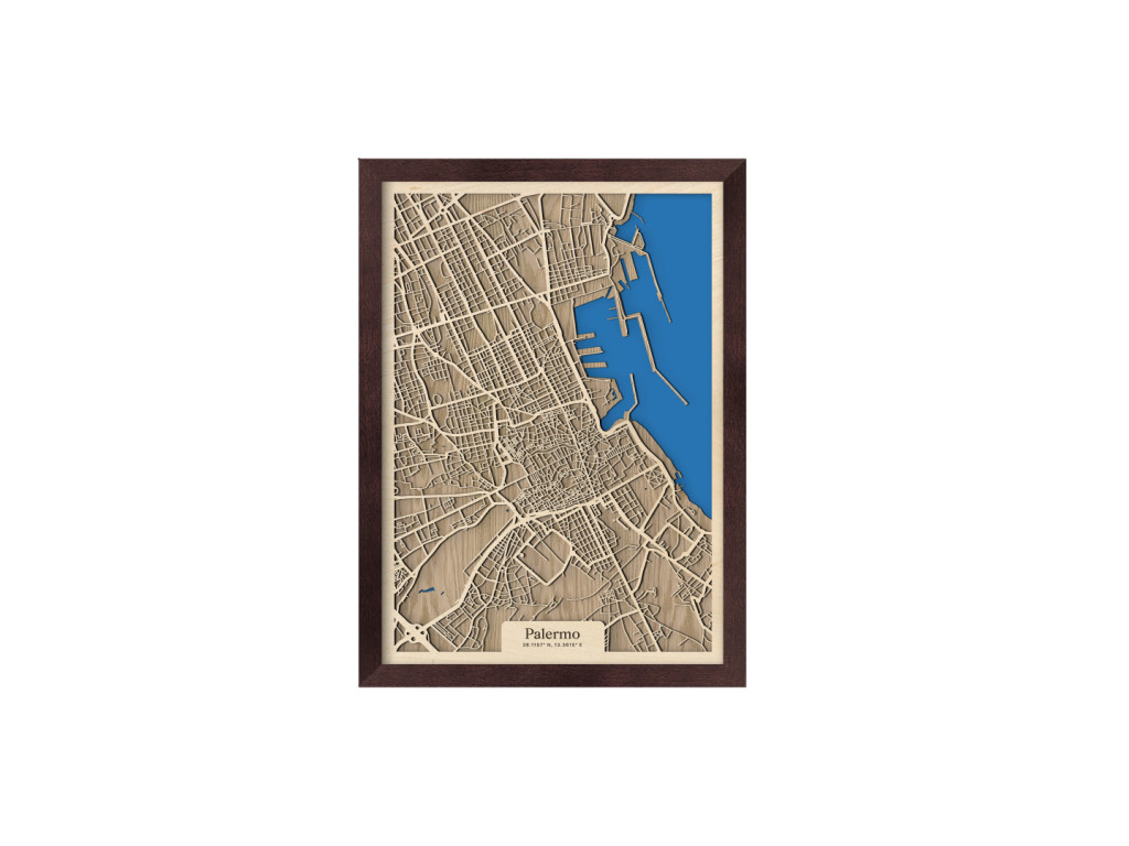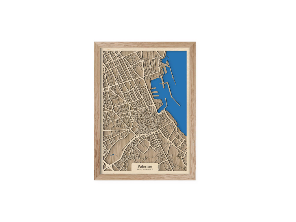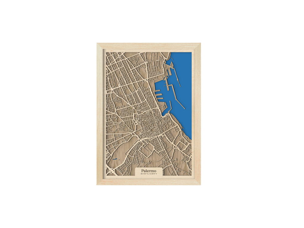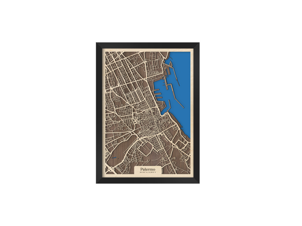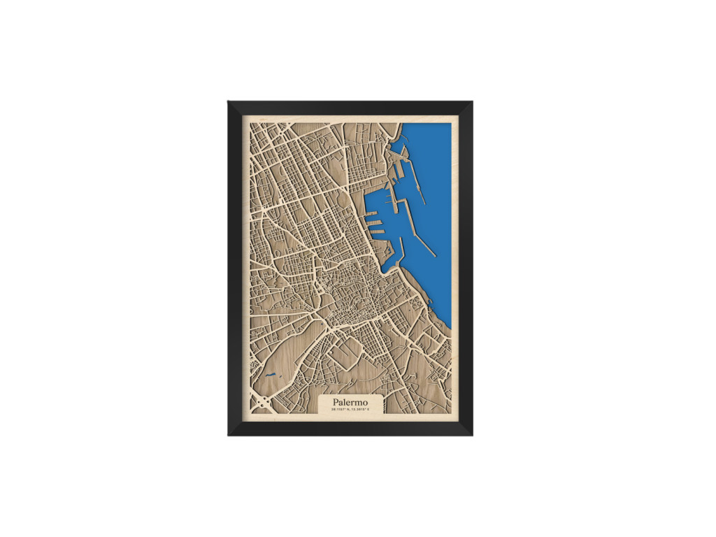 Bellissima! Aj tak by sa dala opísať 3D mapa Palerma. Ako aj iné obrazy z kolekcie drevko CITY, aj tento rámuje ulice hlavného mesta Sicílie. V drevenom ráme zachytávame tie najdôležitejšie štvrte ako historické centrum, Politeama, Borgo Vecchio, Castellammare o Loggie, Monte di Pietà, Kalsa, Albergheria, Corso dei Mille, Settecannoli, Guadagna, Zisa či Montegrappa. Zrak však upúta najmä Porto di Palermo, ktoré je jedným z najvýznamnejších prístavov na Tyrrhenskom mori znázornenom sýtou modrou farbou.
