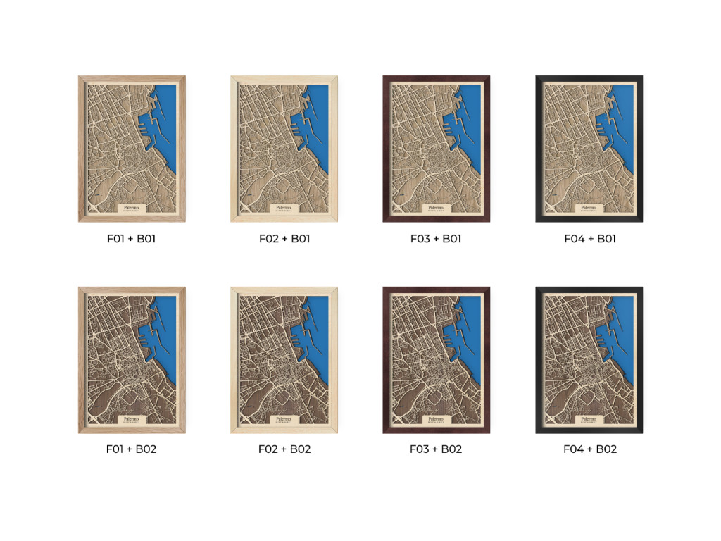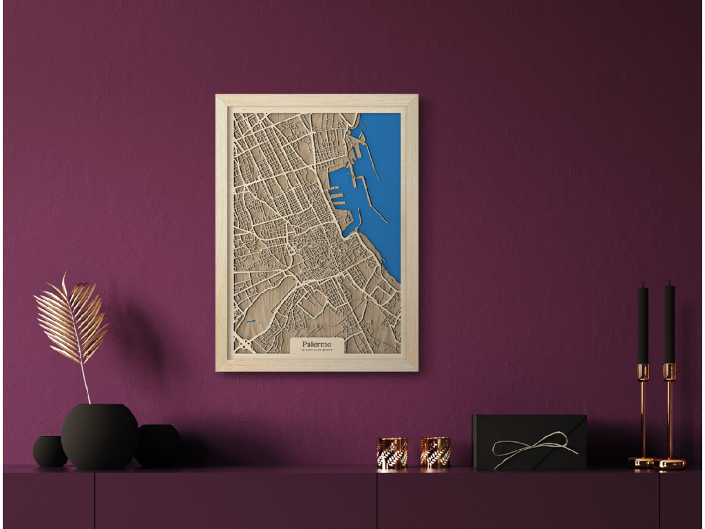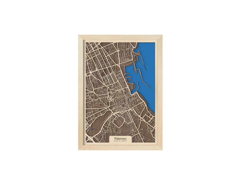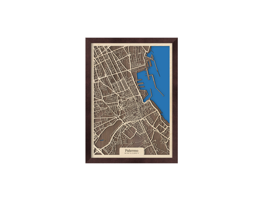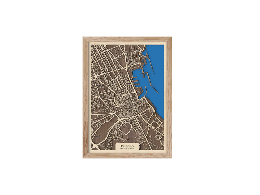 Bellissima! Aj tak by sa dala opísať 3D mapa Palerma. Ako aj iné obrazy z kolekcie drevko CITY, aj tento rámuje ulice hlavného mesta Sicílie. V drevenom ráme zachytávame tie najdôležitejšie štvrte ako historické centrum, Politeama, Borgo Vecchio, Castellammare o Loggie, Monte di Pietà, Kalsa, Albergheria, Corso dei Mille, Settecannoli, Guadagna, Zisa či Montegrappa. Zrak však upúta najmä Porto di Palermo, ktoré je jedným z najvýznamnejších prístavov na Tyrrhenskom mori znázornenom sýtou modrou farbou.