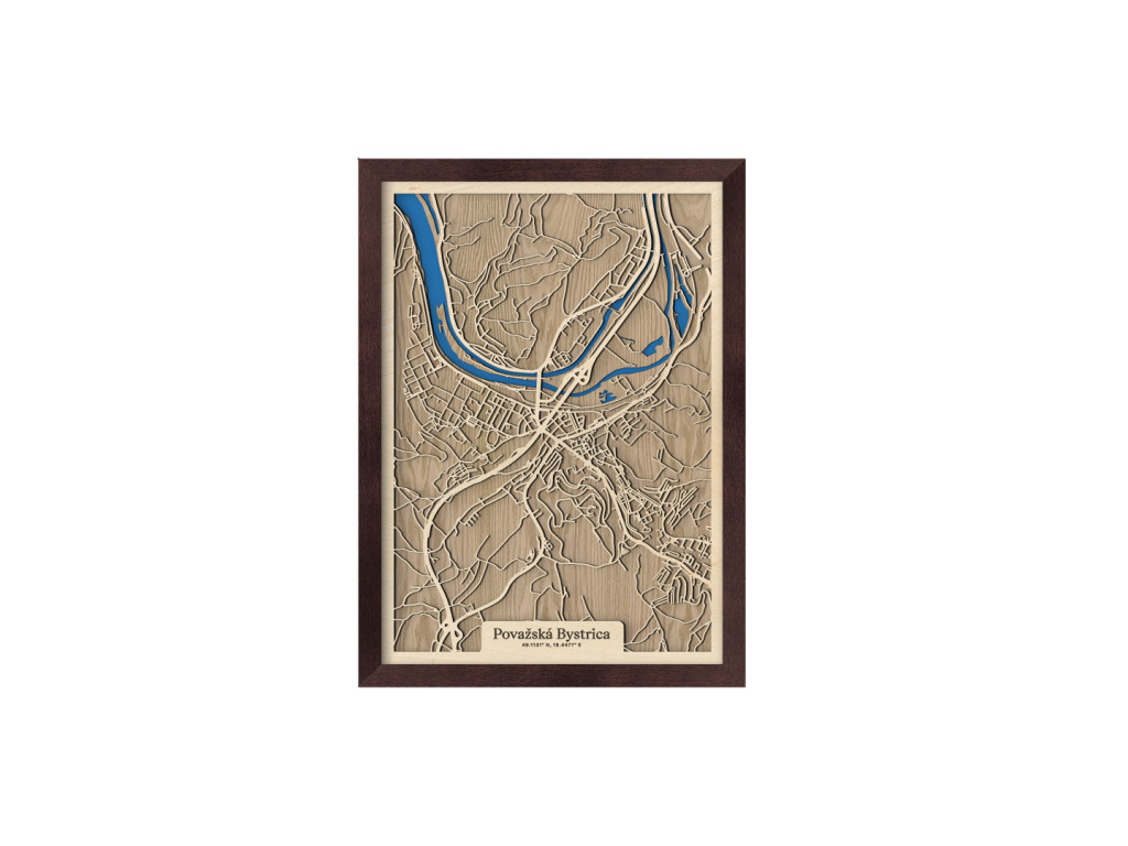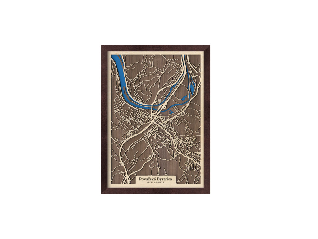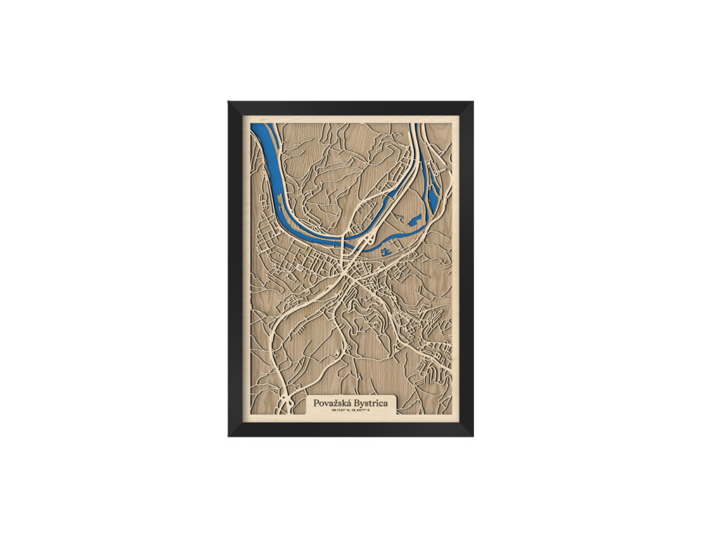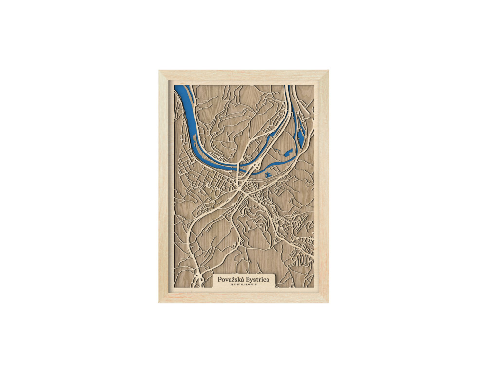 Pripadajú vám ulice tejto mapy dôverne známe? Drevený obraz Považskej Bystrice okrem centra tvorí Považské Podhradie, Považská Teplá, Orlové, Horný Milochov, Jelšové, Hliníky či Lazy. Hornú časť mapy Považská Bystrica z kolekcie drevko CITY na modro rozžiaril Váh a Vážska kaskáda ústiaca do vodnej nádrže Nosice. Veríme, že obraz s výberom rozmeru a farebnej kombinácie na mieru poteší nielen miestnych, ale aj návštevníkov regiónu obklopeného prírodou Javorníkov, Strážovských a Súľovských vrchov.