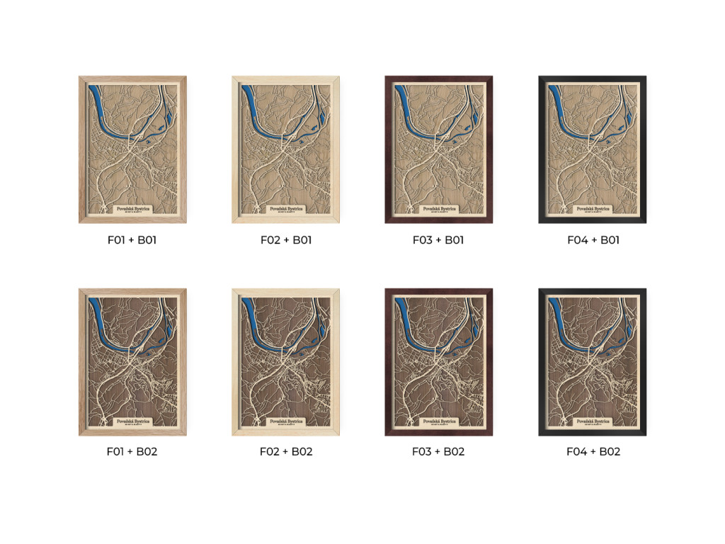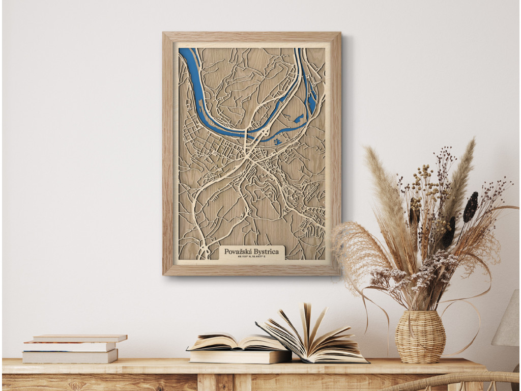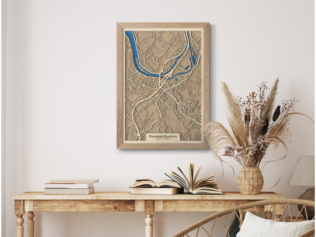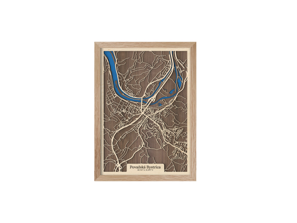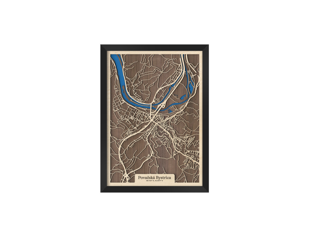 Pripadajú vám ulice tejto mapy dôverne známe? Drevený obraz Považskej Bystrice okrem centra tvorí Považské Podhradie, Považská Teplá, Orlové, Horný Milochov, Jelšové, Hliníky či Lazy. Hornú časť mapy Považská Bystrica z kolekcie drevko CITY na modro rozžiaril Váh a Vážska kaskáda ústiaca do vodnej nádrže Nosice. Veríme, že obraz s výberom rozmeru a farebnej kombinácie na mieru poteší nielen miestnych, ale aj návštevníkov regiónu obklopeného prírodou Javorníkov, Strážovských a Súľovských vrchov.