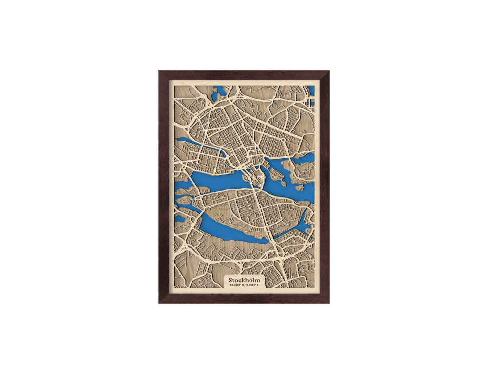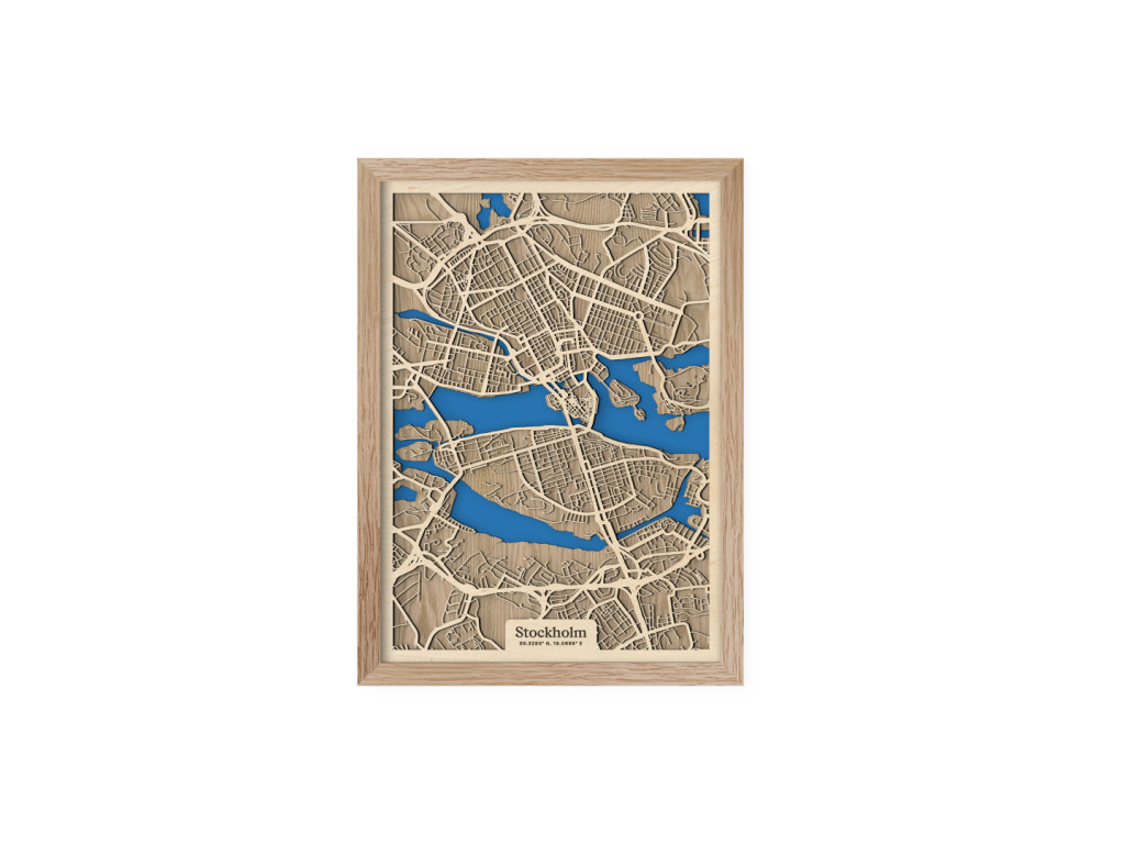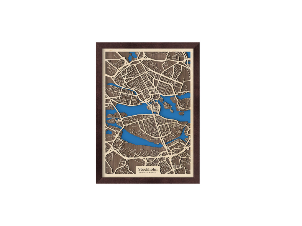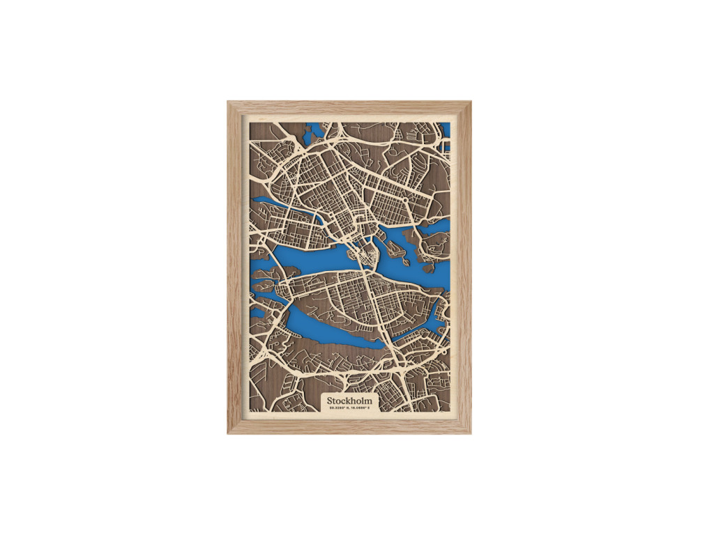 Benátky severu či srdce Škandinávie. Nečudo, že hlavné mesto Švédska si vyslúžilo práve takéto prezývky. Leží na desiatkach ostrovov na jazere Mälaren pospájaných mostami. Drevená mapa Štokholm zachytáva centrum v kolekcii drevko CITY z vtáčej perspektívy. Spoznáte tu štvrte Vasastaden, Norrmalm, Östermalm, Kungsholmen, Gamla Stan, Södermalm či Årsta? S radosťou vám ich zarámujeme vo veľkosti a farbách na mieru. Obraz Štokholm si stačí ľubovoľne vyskladať podľa parametrov nižšie.