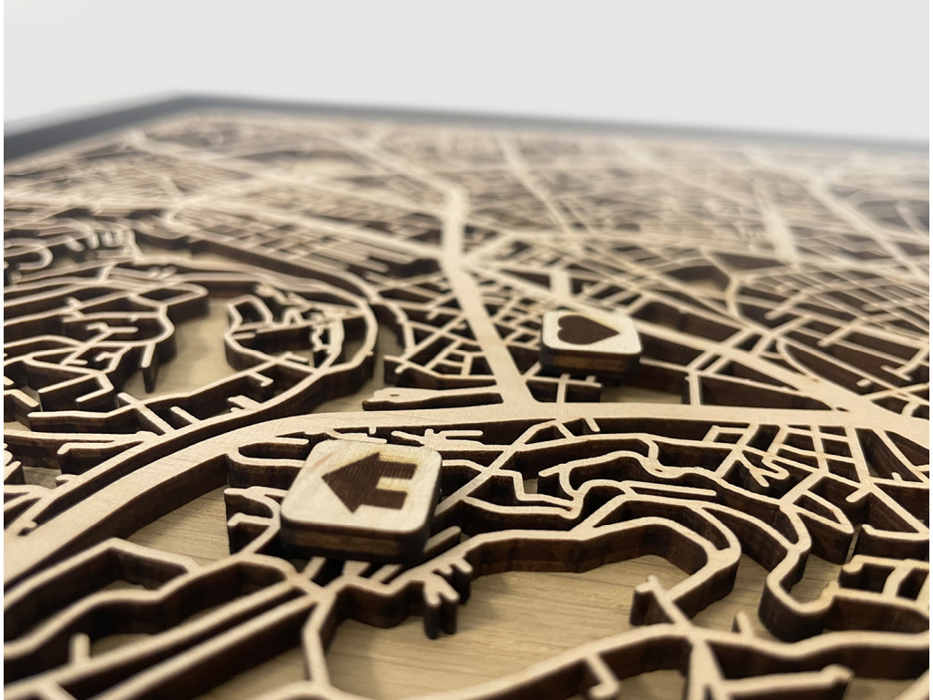 Oživte svoju drevenú mapu CITY jedinečnými ikonami – domček, srdce, poloha, prsteň, lietadlo a kostol. Dokonalý spôsob, ako označiť miesta plné významu a spomienok!