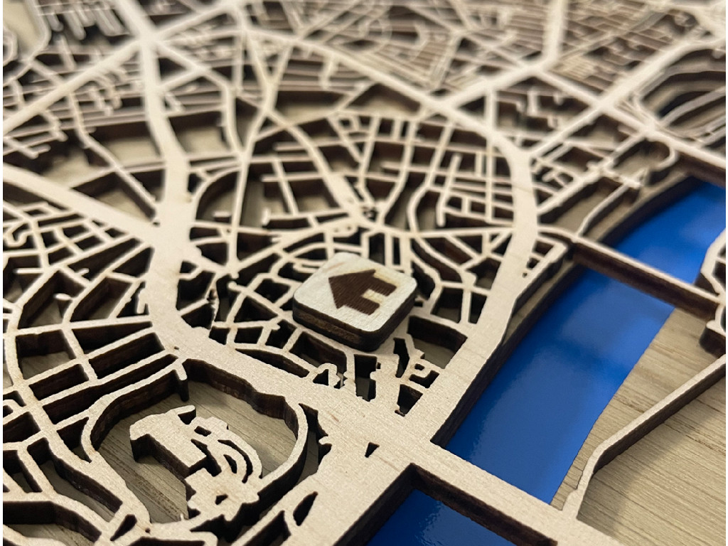 Montáž ikoniek je rýchla a jednoduchá. Stačí na zadnú stranu ikonky naniesť trochu lepidla na drevo (alebo sekundového lepidla) a prilepiť ju na vrstvu s ulicami a cestami na mape. Po zaschnutí je mapa pripravená na zavesenie na stenu alebo na darovanie ako jedinečný darček.