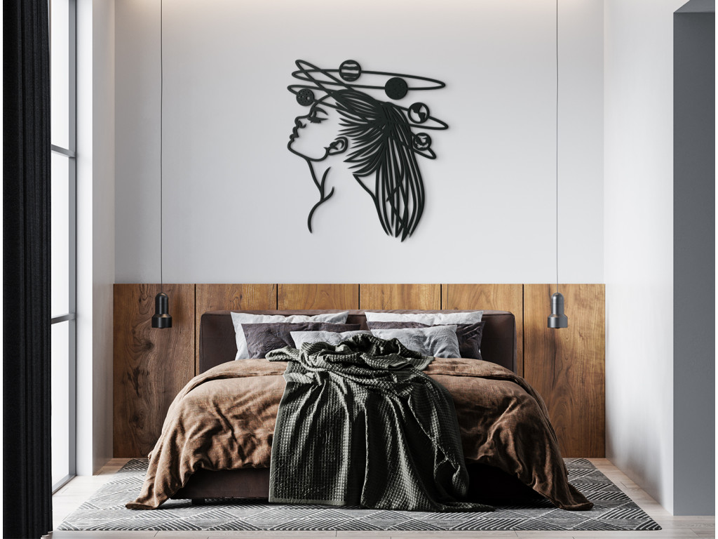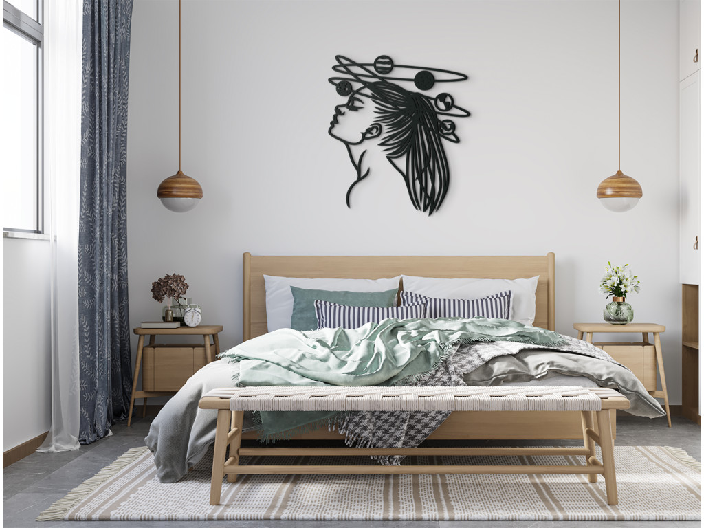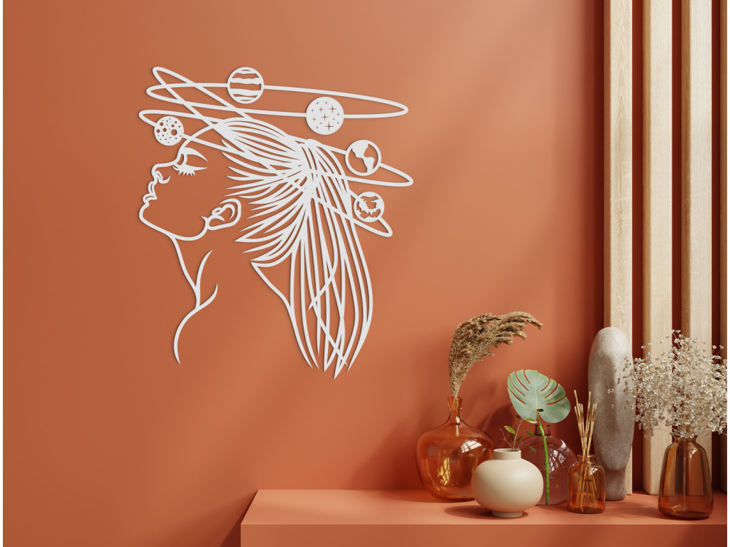 Élégante, moderne et intemporelle. Nous parlons de l'autocollant en bois Femme dans l'espace, qui s'intègre dans tous les intérieurs. La femme représentée sur la décoration regarde dans l'espace tandis que les planètes du système solaire tournent au-dessus de sa tête. La décoration convient aussi bien aux petits qu'aux grands espaces.