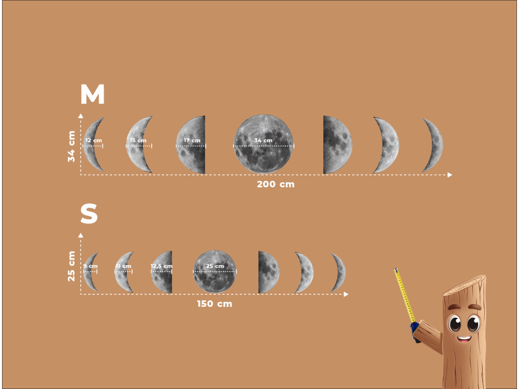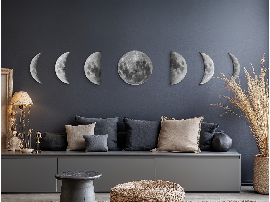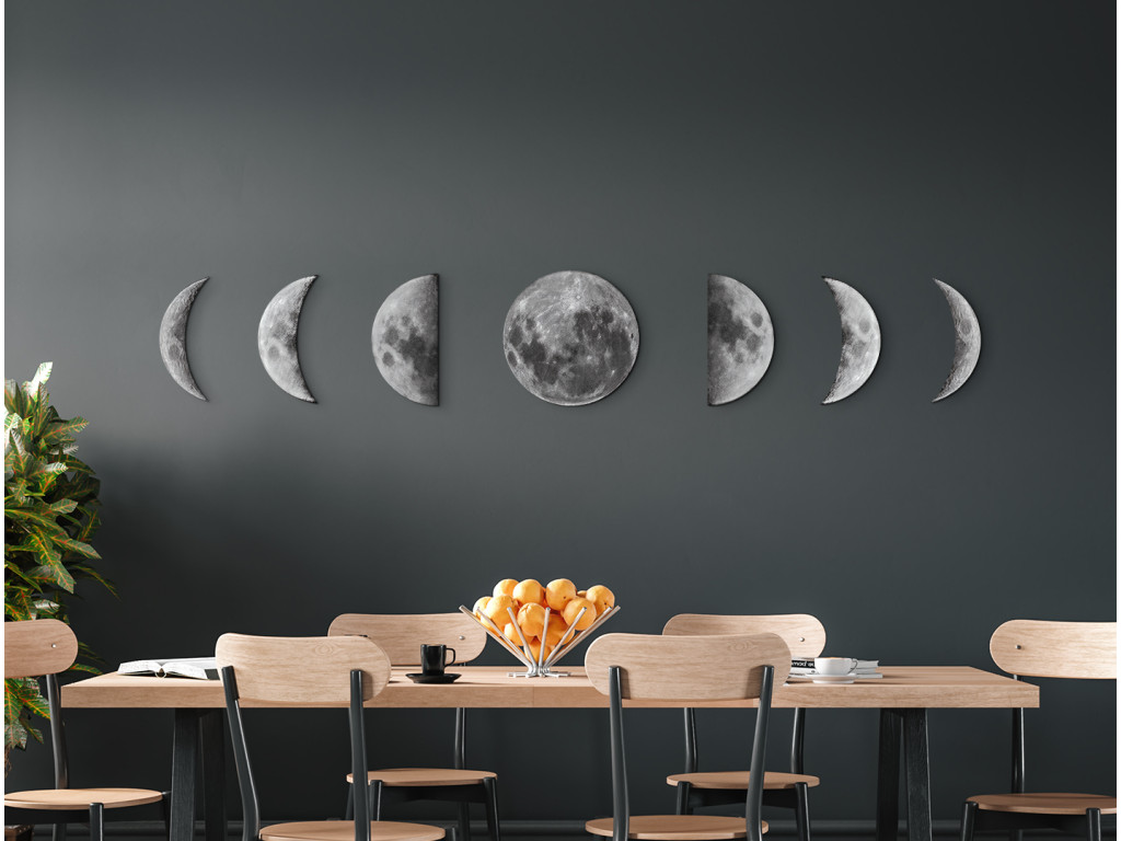 L'image représente le cycle complet des phases de la Lune au cours de son orbite de 29,5 jours autour de la Terre. Les différentes phases montrent comment la partie éclairée de la Lune change en fonction de la position du Soleil, de la Terre et de la Lune. Grâce à sa conception claire, l'image convient à un bureau, une chambre d'enfant ou un espace éducatif en tant qu'élément esthétique et instructif.