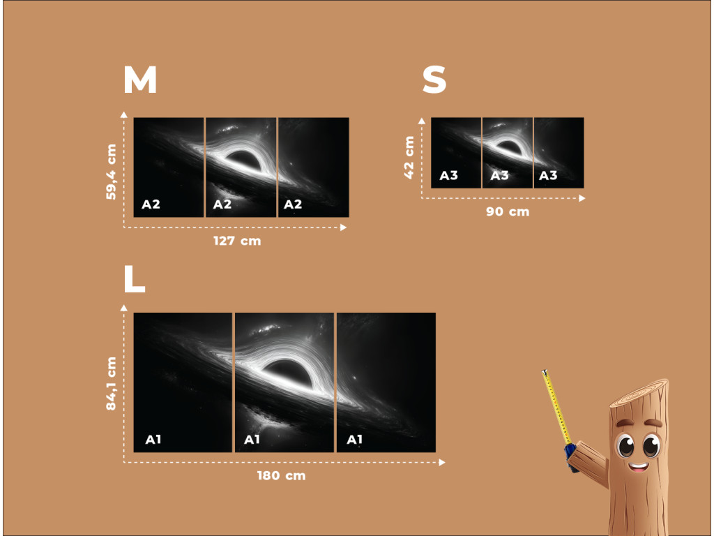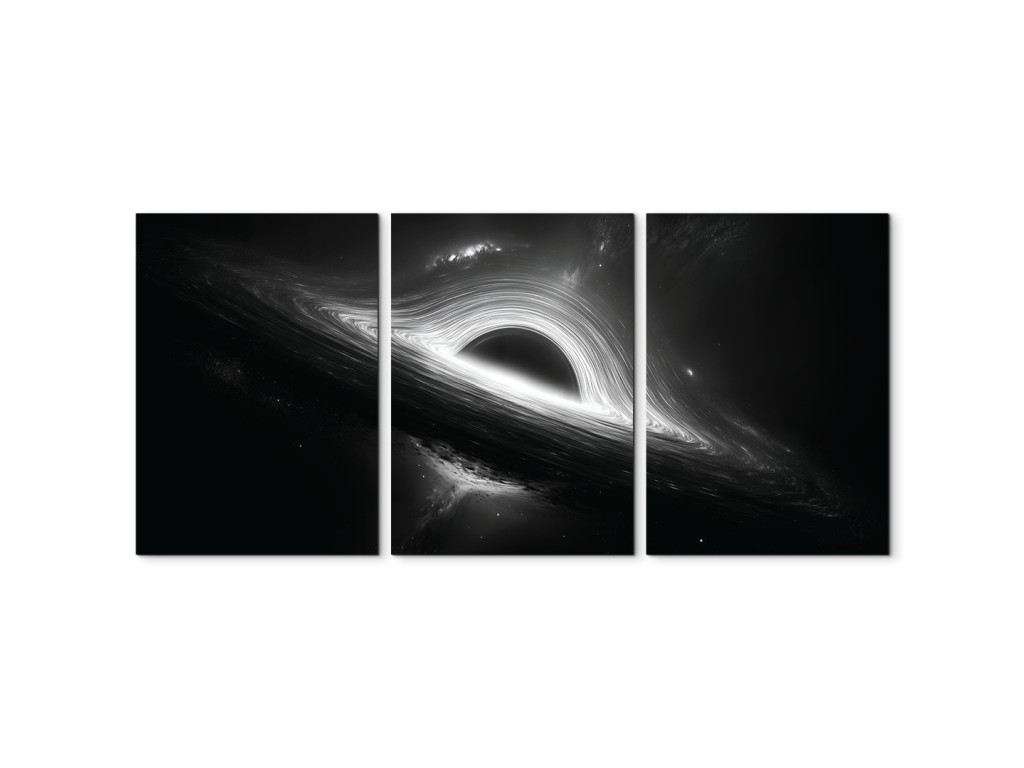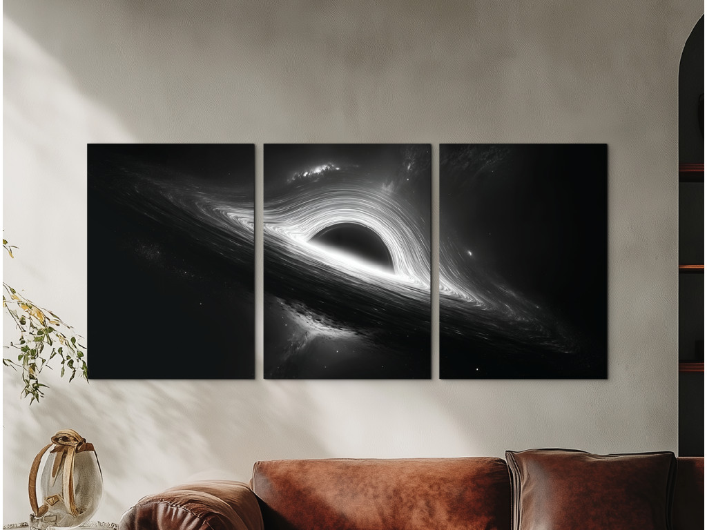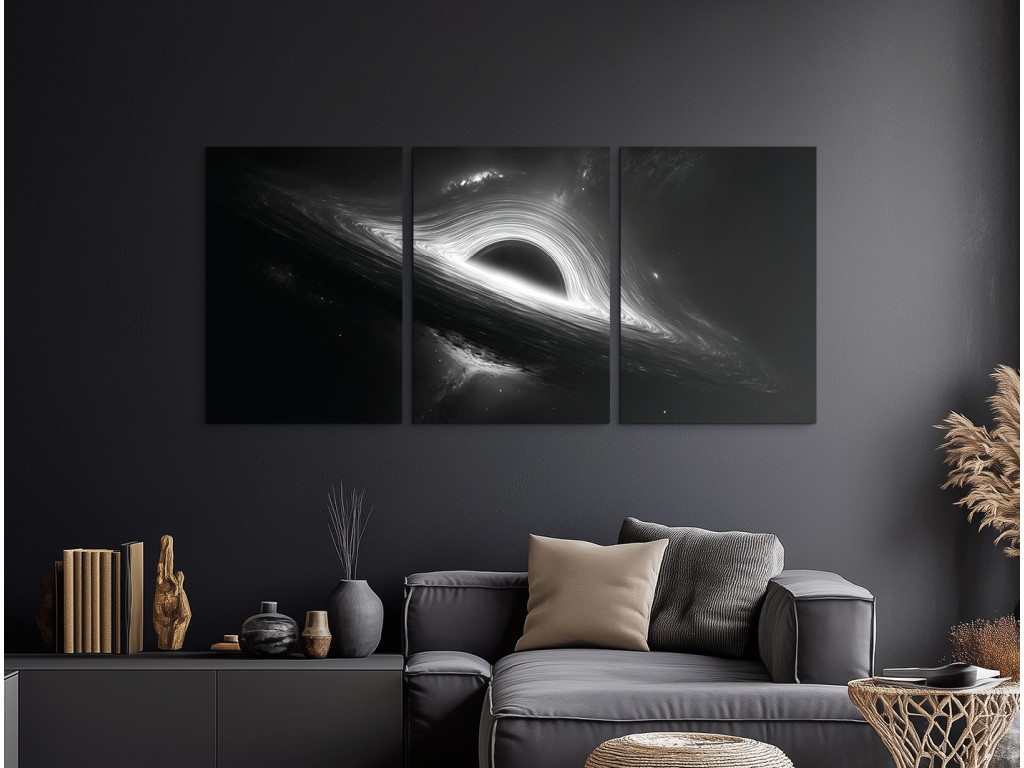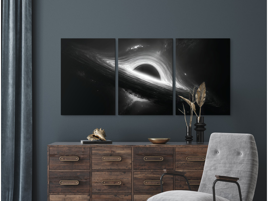 Le tableau en trois parties représentant un trou noir apporte à la pièce une énergie forte et concentrée, répartie dans un ensemble harmonieux. Les tons noir et blanc et l'impression UV de haute qualité soulignent la profondeur, le contraste et la fluidité entre les différentes parties. Elle sera particulièrement mise en valeur sur un grand mur dans un salon moderne, un bureau ou un studio, où elle constituera un élément visuel dominant.