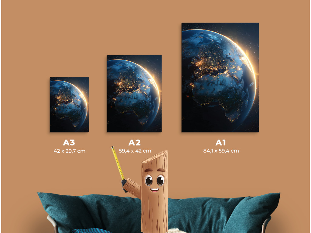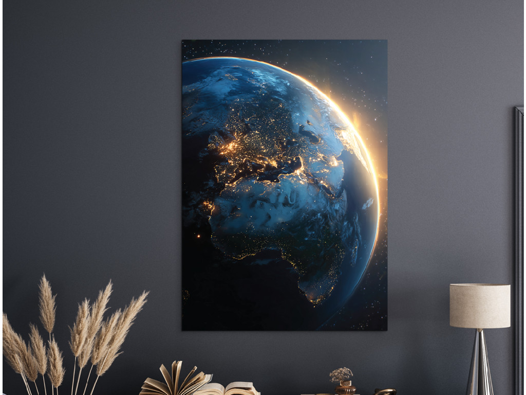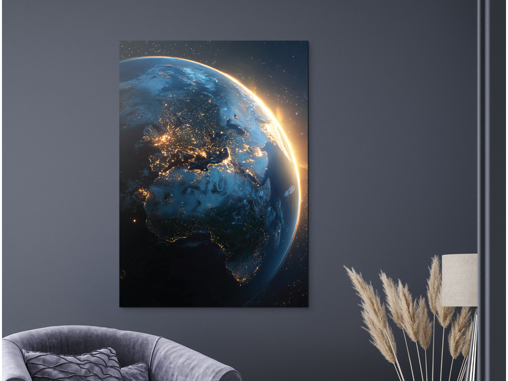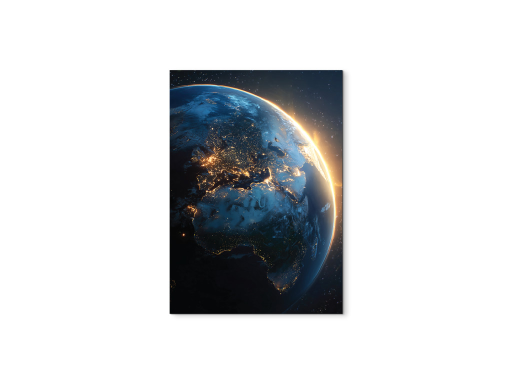 L'image de la Terre vue de l'espace capture la transition spectaculaire entre la nuit et le jour au-dessus de l'Europe, de l'Afrique et de l'Australie. Les lumières des villes contrastent avec l'horizon ensoleillé qui souligne la courbure de la planète. Les tons bleu foncé et dorés chauds ressortent grâce à l'impression UV et l'image s'intègre parfaitement dans un intérieur moderne ou un bureau.