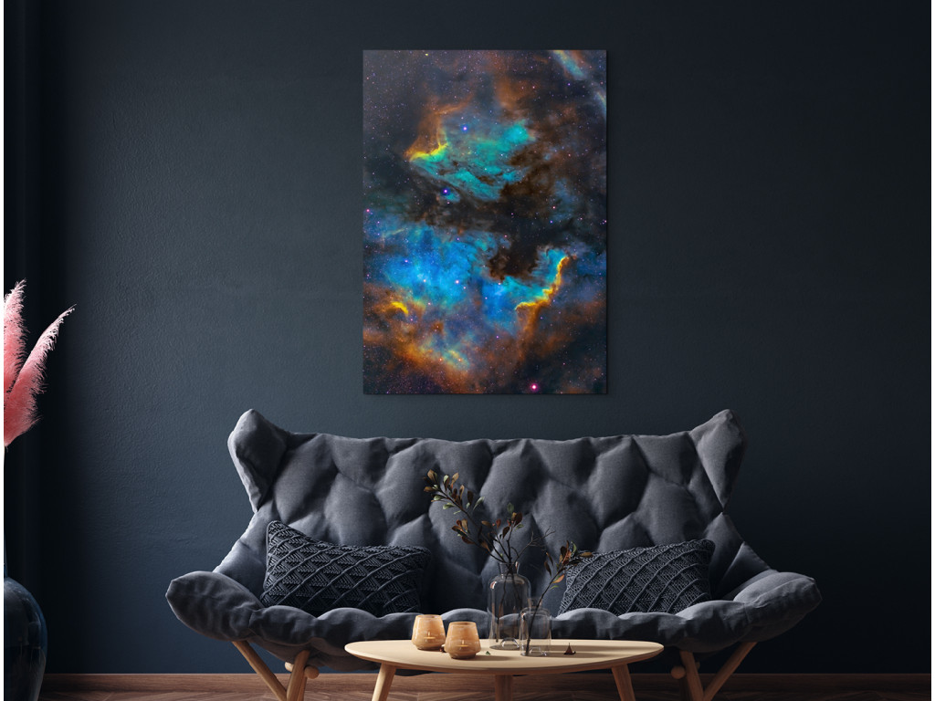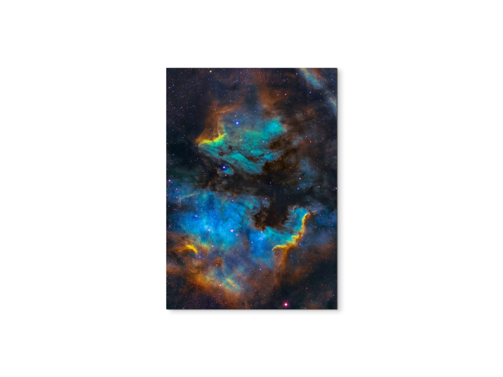 La photo de la nébuleuse du Pélican dans la constellation du Cygne attire l'attention par sa forme rappelant un oiseau en vol. Les zones lumineuses d'hydrogène ionisé créent une composition dramatique mais harmonieuse à proximité de la nébuleuse Amérique du Nord. Grâce à l'impression UV, les couleurs et les structures ressortent et l'image convient à un intérieur moderne ou à un bureau pour les amateurs d'espace.