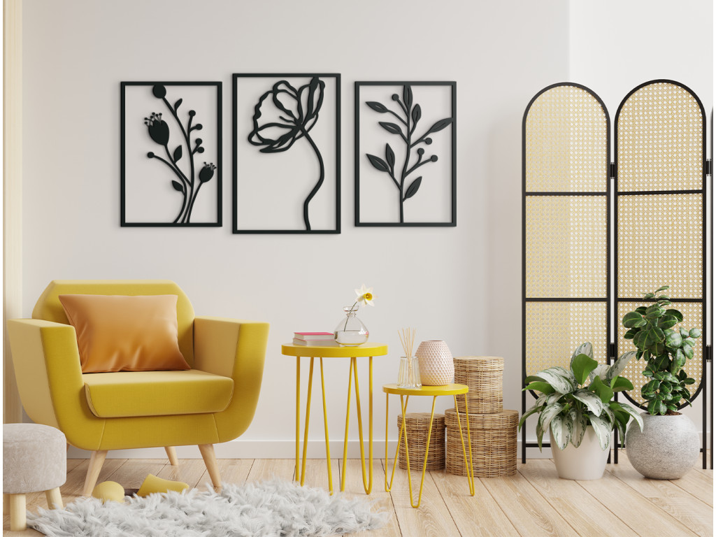La décoration en bois Fleurs des champs convient à la salle à manger, à la cuisine, au couloir et au salon. Cet autocollant moderne se compose de trois parties qui forment un ensemble harmonieux.