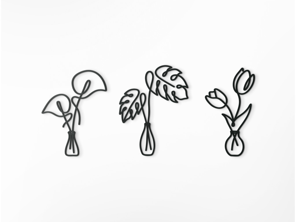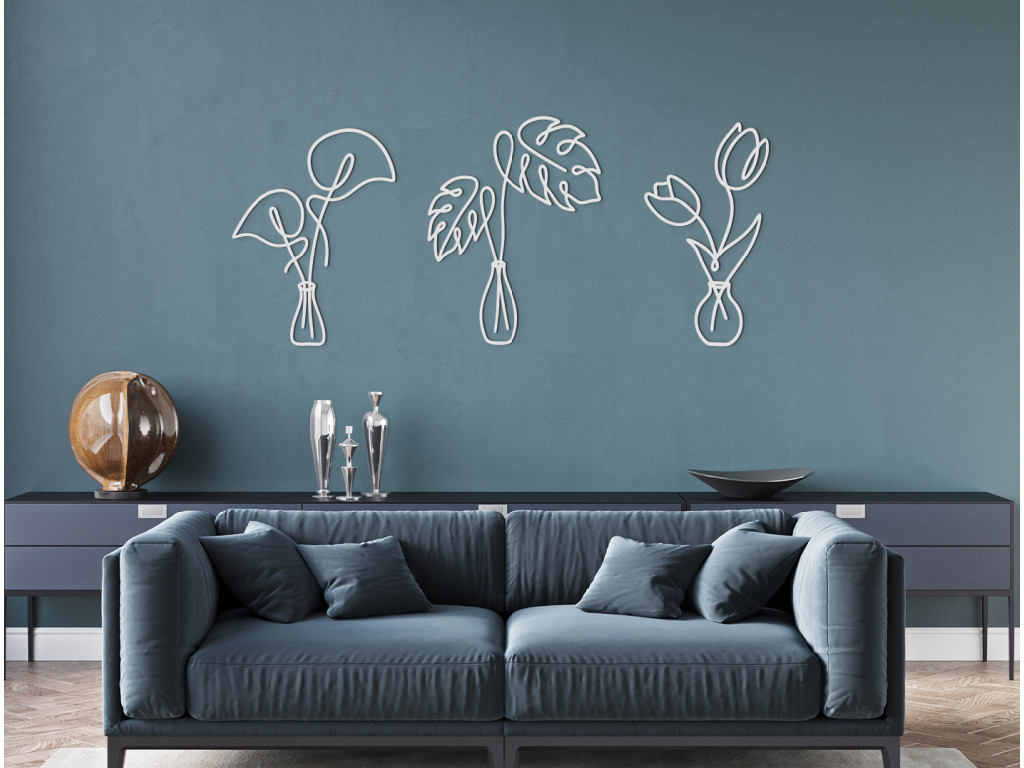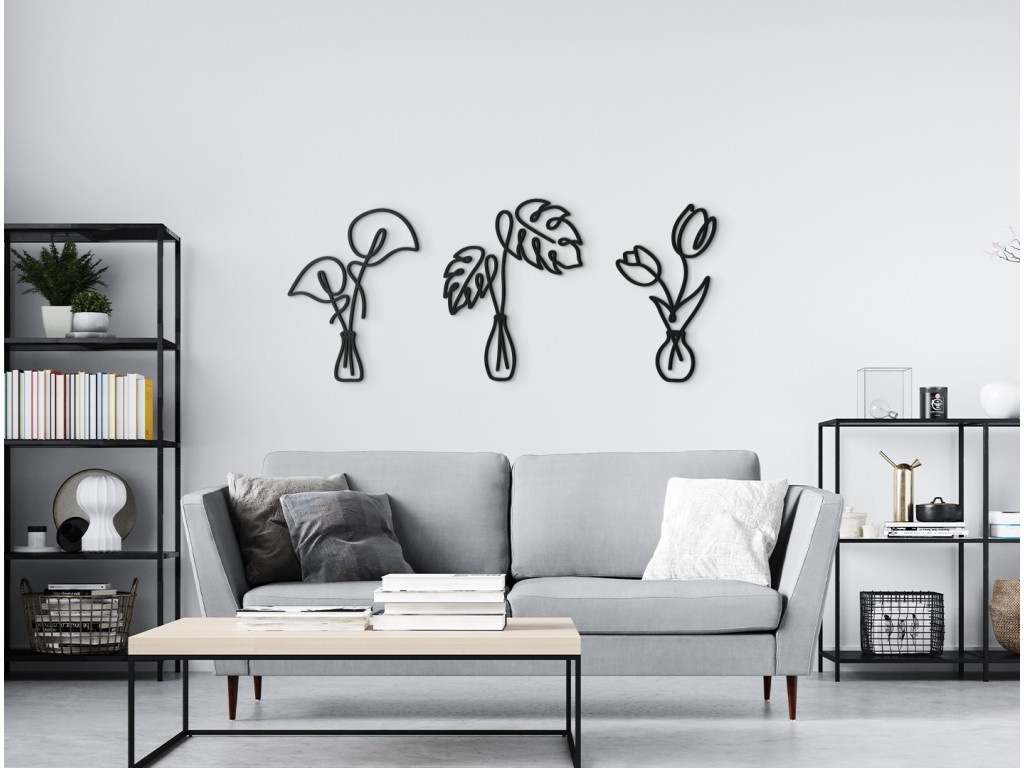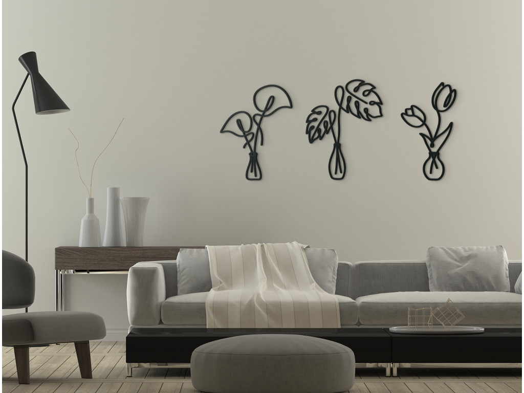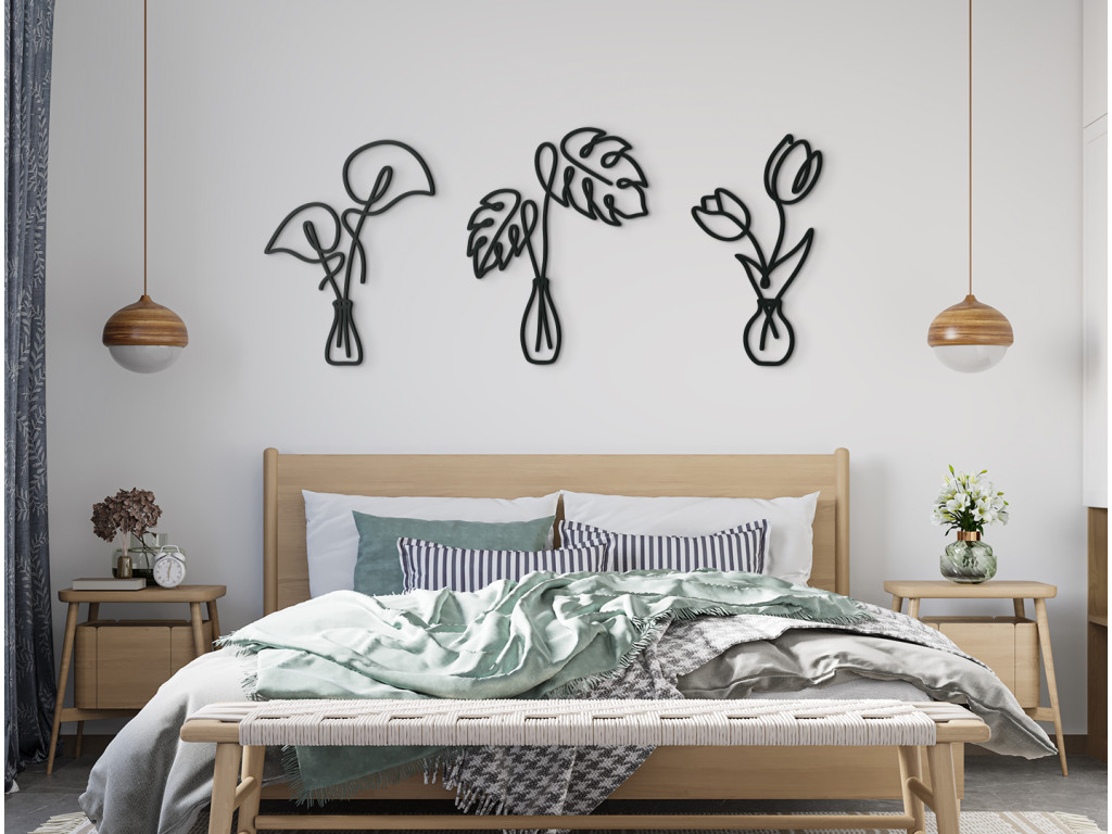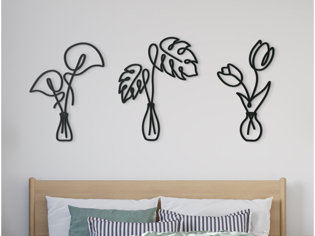 Minimalistické nálepky na stenu vnesú do interiéru elegantný a príjemný dizajn. V prvej váze sa nachádzajú kaly, druhú vázu zdobia listy monstery a tretia váza vyniká dvoma krásnymi tulipánmi. Takéto drevené nálepky môžete umiestniť na akúkoľvek stenu do spálne, kuchyne, chodby či predsiene.