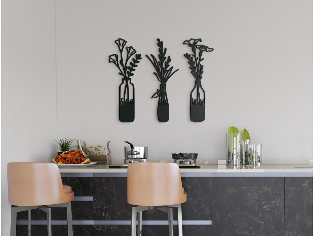 Skrášlite interiér modernými kvetmi vo váze. Pokiaľ nebudete mať doma tie živé, ozdobou vám budú drevené kvety. Moderná dekorácia sa skladá z 3 dielov. V prvej váze sú tulipány, druhá váza vykresľuje poľné kvety a v tretej žiaria ľalie. Každá váza ma iný tvar, preto na stene obraz vynikne. Dekorácia je vhodná do jedálne, kuchyne, chodby aj obývačky.