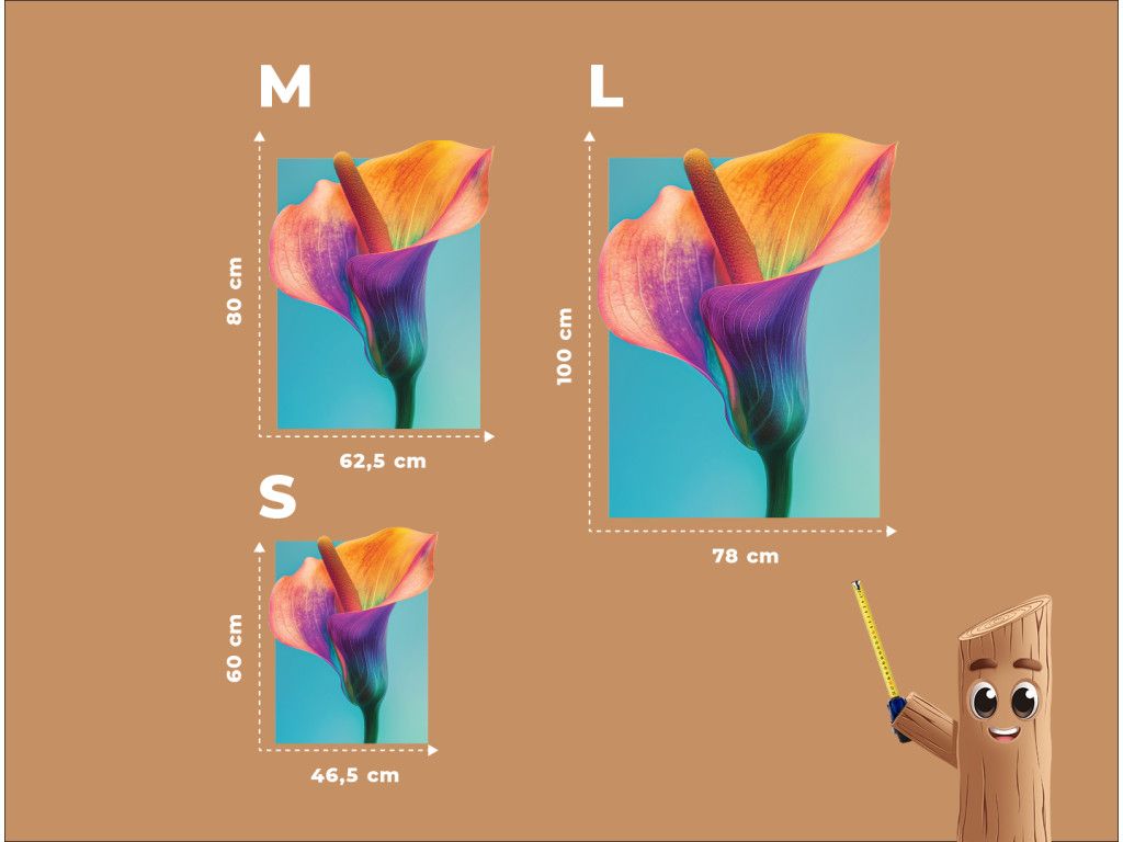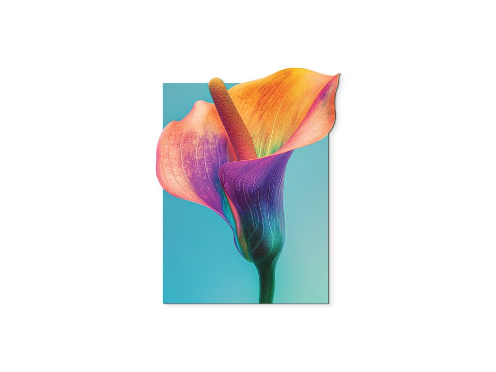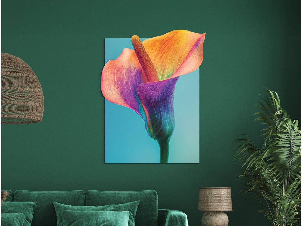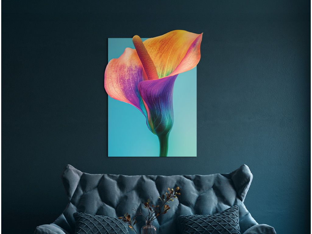 La représentation artistique de callas dans des tons orange et violet sur un fond bleu intense crée un contraste visuel saisissant, plein d'élégance et d'harmonie. Les couleurs vives de la fleur sont à la fois franches et douces, soulignant les lignes gracieuses de la forme tubulaire du calla. L'œuvre combine des tons chauds et froids dans un ensemble équilibré, à la fois moderne, calme et sensuel.