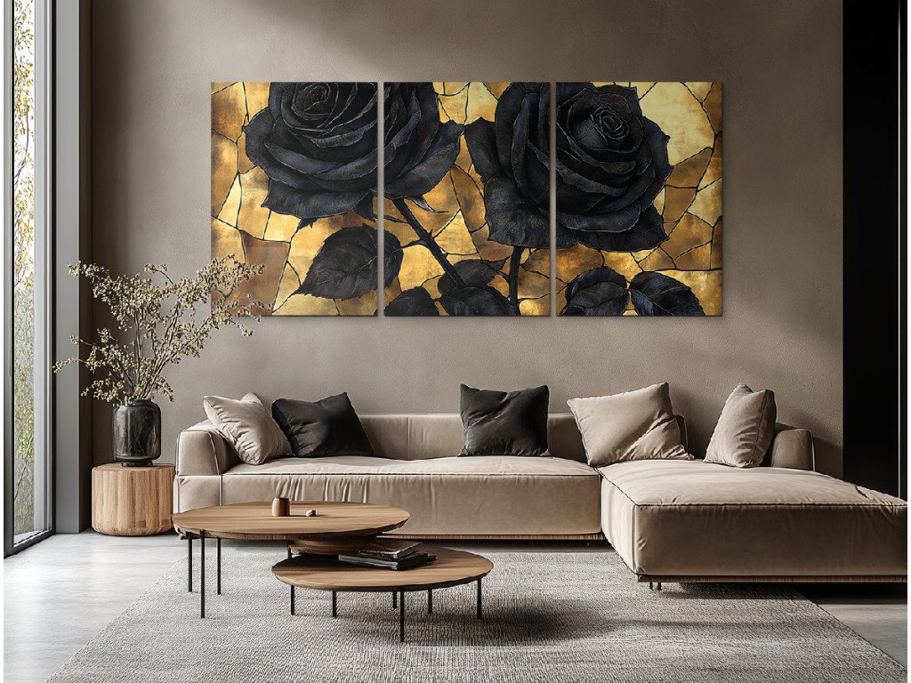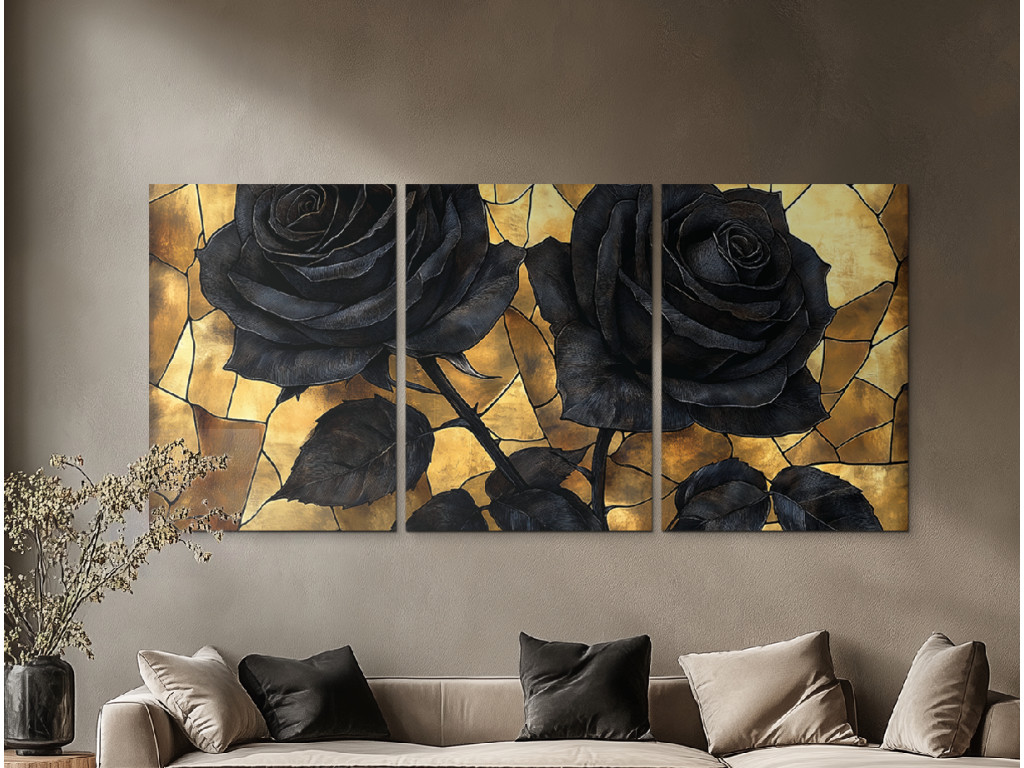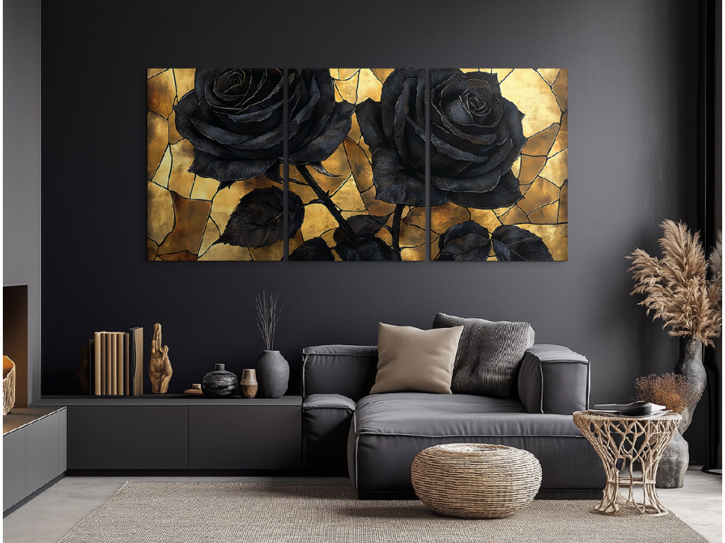 La mosaïque de roses noires est un tableau en trois parties avec un contraste original : deux roses noires placées sur un fond rappelant une mosaïque dorée ou les éclats brillants d'un vase brisé. La combinaison d'un motif floral sombre et d'un fond irrégulier et doré crée une impression de luxe, de drame subtil et de détail artistique.